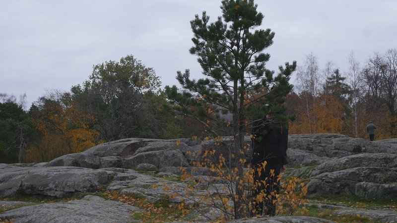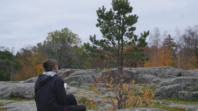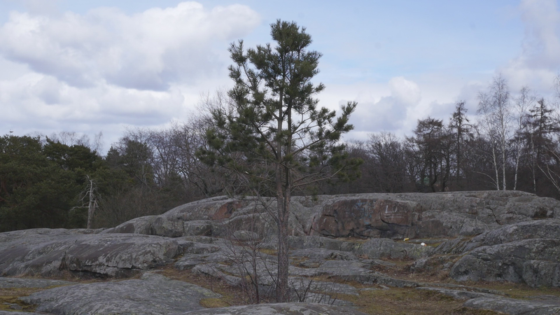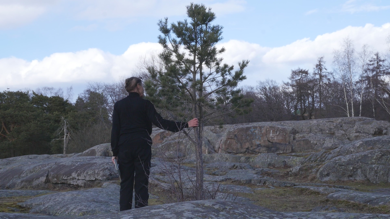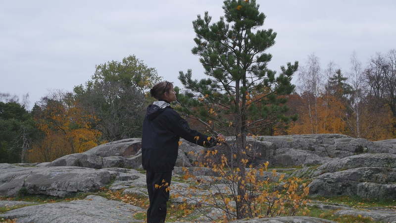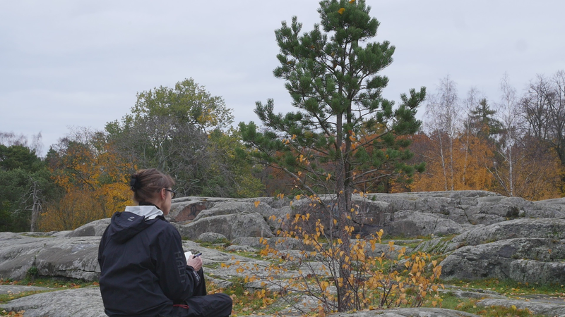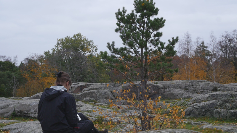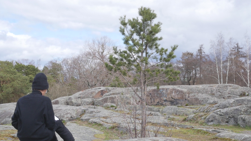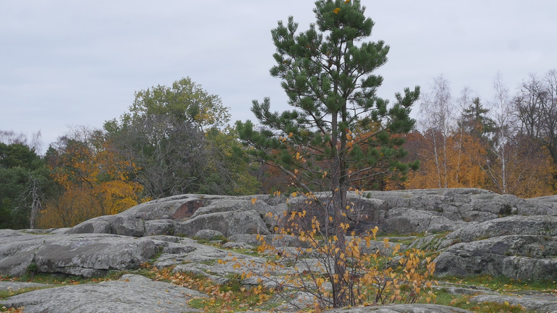 I hope you don’t mind that I address you in English this time. The reason is that I am participating in an international Live Art event with other people performing with trees in other parts of the globe, or on the earth. And that takes place via zoom, with the help of my phone, right behind me. As you might remember, or then not, last time we met I thought I would say goodbye for a while, and that I felt that our contact or communication was not really going anywhere… Well, if you start a relationship with a tree you cannot really expect it “going anywhere” at least not literally. Trees are sessile beings par excellence, reliable to stay where they are “till death do us parts”, as they say. But, I meant that I did not really feel you were interested in communication, or perhaps simply, brutally, that I was no longer inspired by you; I did not like myself in your company; I did not like the thoughts that came to me while in your company – whether they were induced or inspired by you or not. That said, when this opportunity to join in an event with other tree-lovers occurred, I immediately thought of you! One reason for that was quite practical; the ferryboat to the island where I have most of my tree friends, does not run any longer – it stopped for the winter. And although I have a rowing boat, and today the weather is very calm, perfect for rowing across, I could not know that beforehand. You live here right next door to me, in the centre of the south of Helsinki, and in a funny place right up on the rocky hill, alone, so it is relatively easy to perform together with you without other trees, bigger and more spectacular ones, catching all the attention. The rocks are frequented by people, of course, this is a public park, and in summertime there are plenty of parties here. Now only one family is playing around nearby, and they will probably not stay for long. The chilly weather has made your little birch companion to let go of their leaves, but some trees, like the alders, are still green. More people coming – funny, I did not expect that, But, if they don’t disturb you, then I will not be disturbed either. Complaining kids! That is the last thing you would imagine a small pine tree would be surrounded by. – It is a strange place to live that you have chosen [or perhaps you did not have much choice, actually, simply landing here] – not because it is a public park, but, because there is so little soil in the small crevice where you are rooted with the birch. Probably you root is working hard to press forward downwards towards the centre of the earth. This is at least what philosopher Emanuele Coccia claims. Plants grow actively in two directions, up towards the sun, and down towards the centre of the earth. So, you are a cosmic being, like the famous world tree! Some strange noise from the shore behind me is getting louder; is it a boat or a truck or what? It seems hardly to move… I wonder if you sense the vibrations – probably. Such low frequencies are making “bigger waves”, if I remember correctly… I am going to write three separate letters to you, in order to be able to turn off and on again my video camera. Although the zoom event is recorded somehow, I also wanted to make an “ordinary” video of this longer meeting. And because my video camera can record only 21 minutes at a time, this hour will be divided in three 20-minute slots. So, I will leave you for a moment, and then come back again, soon. – I will be lucky to be able to check if my phone is still working, too…