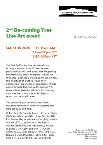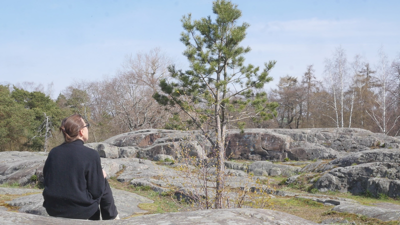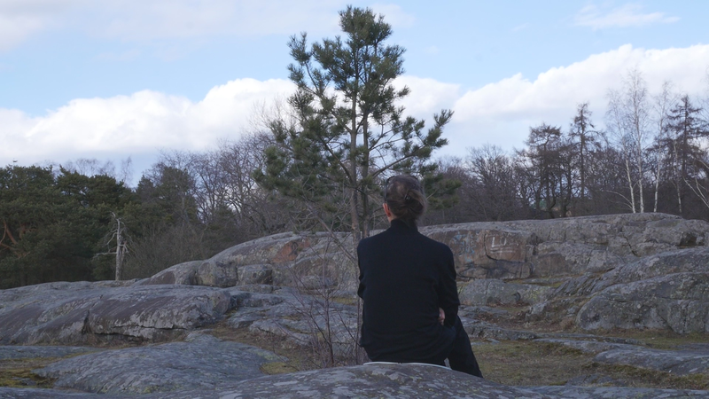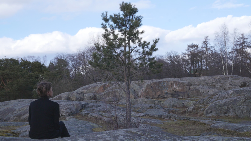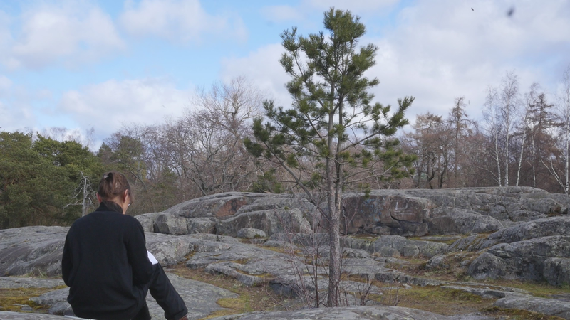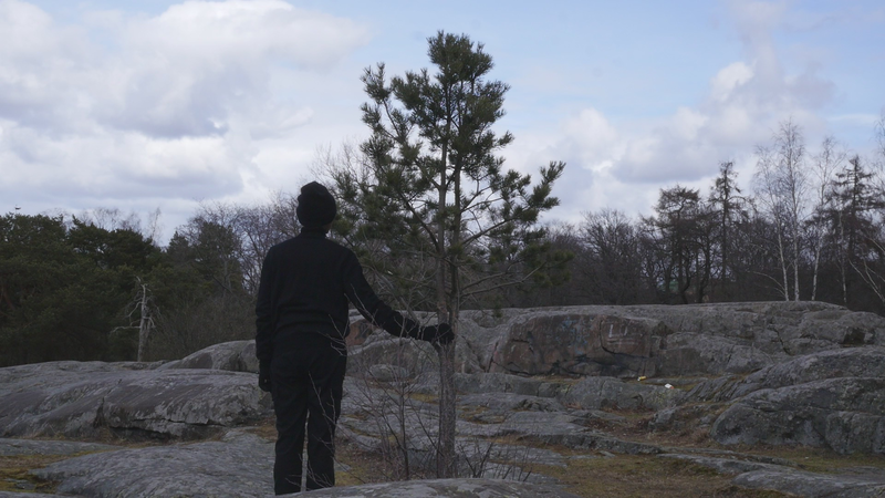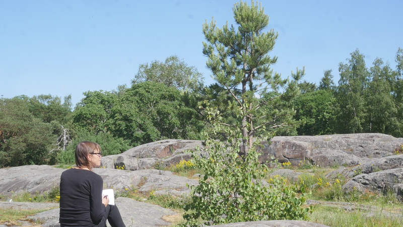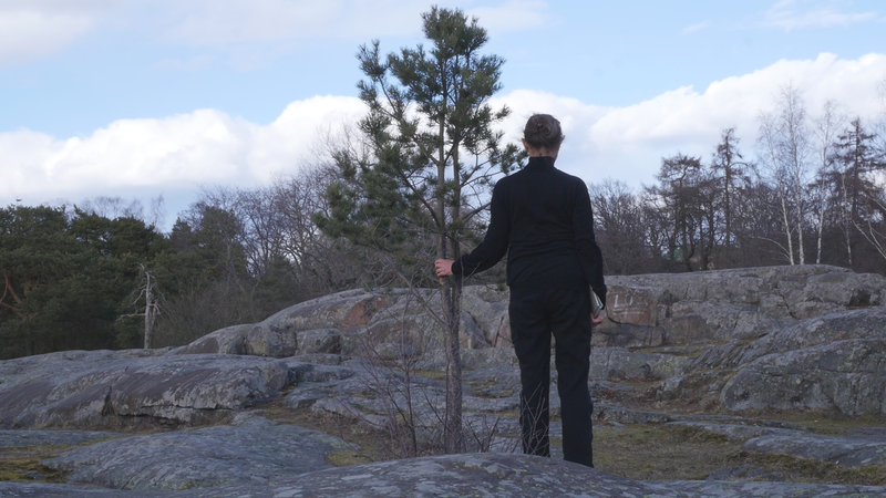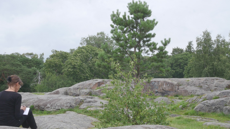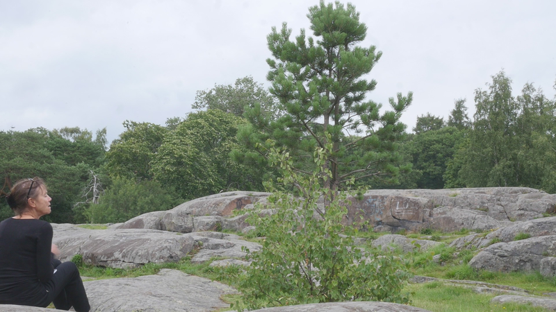 I hope you don’t mind that I address you in English this time. The reason is that I am participating in an international Live Art event with other people performing with trees in other parts of the globe, or on the earth. And that takes place via zoom, with the help of my phone, right behind me. As you might remember, or then not, last time we met I thought I would say goodbye for a while, and that I felt that our contact or communication was not really going anywhere… Well, if you start a relationship with a tree you cannot really expect it “going anywhere” at least not literally. Trees are sessile beings par excellence, reliable to stay where they are “till death do us parts”, as they say. But, I meant that I did not really feel you were interested in communication, or perhaps simply, brutally, that I was no longer inspired by you; I did not like myself in your company; I did not like the thoughts that came to me while in your company – whether they were induced or inspired by you or not. That said, when this opportunity to join in an event with other tree-lovers occurred, I immediately thought of you! One reason for that was quite practical; the ferryboat to the island where I have most of my tree friends, does not run any longer – it stopped for the winter. And although I have a rowing boat, and today the weather is very calm, perfect for rowing across, I could not know that beforehand. You live here right next door to me, in the centre of the south of Helsinki, and in a funny place right up on the rocky hill, alone, so it is relatively easy to perform together with you without other trees, bigger and more spectacular ones, catching all the attention. The rocks are frequented by people, of course, this is a public park, and in summertime there are plenty of parties here. Now only one family is playing around nearby, and they will probably not stay for long. The chilly weather has made your little birch companion to let go of their leaves, but some trees, like the alders, are still green. More people coming – funny, I did not expect that, But, if they don’t disturb you, then I will not be disturbed either. Complaining kids! That is the last thing you would imagine a small pine tree would be surrounded by. – It is a strange place to live that you have chosen [or perhaps you did not have much choice, actually, simply landing here] – not because it is a public park, but, because there is so little soil in the small crevice where you are rooted with the birch. Probably you root is working hard to press forward downwards towards the centre of the earth. This is at least what philosopher Emanuele Coccia claims. Plants grow actively in two directions, up towards the sun, and down towards the centre of the earth. So, you are a cosmic being, like the famous world tree! Some strange noise from the shore behind me is getting louder; is it a boat or a truck or what? It seems hardly to move… I wonder if you sense the vibrations – probably. Such low frequencies are making “bigger waves”, if I remember correctly… I am going to write three separate letters to you, in order to be able to turn off and on again my video camera. Although the zoom event is recorded somehow, I also wanted to make an “ordinary” video of this longer meeting. And because my video camera can record only 21 minutes at a time, this hour will be divided in three 20-minute slots. So, I will leave you for a moment, and then come back again, soon. – I will be lucky to be able to check if my phone is still working, too…
