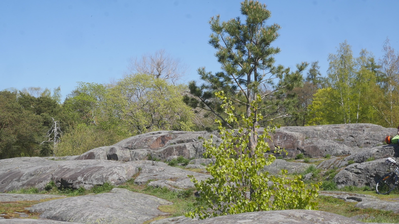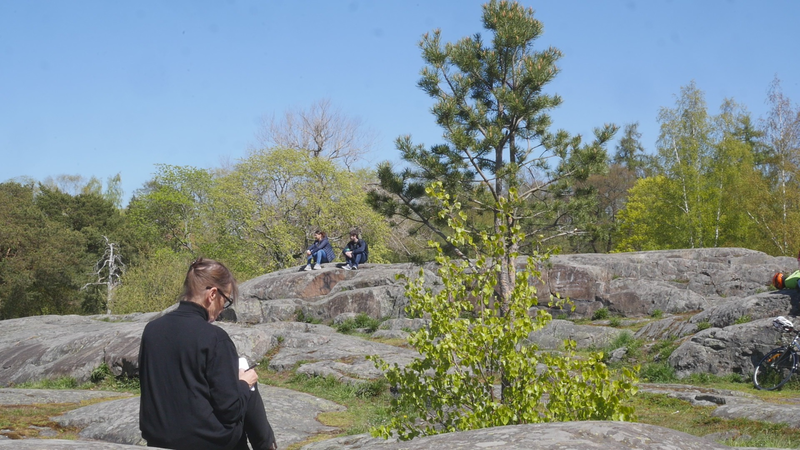 Men annars mår du bra, eller hur? Du ser ut att må bra med alla nya skotten. Och det verkar som barr-knippena var ”buskigare” också. Men såhär års är det nog björken som drar till sig blickarna till sig, det är ofrånkomligt. Den ser ut som en buske med flera skott eller små stammar från samma rot, ingen är längre eller större än de andra. Så det kan hända att den väljer att ligga lågt och bräda ut sig sidledes; då kommer den inte att tävla med dig på höjden. Men det är ju möjligt att den byter stil eller strategi senare, när den vuxit sig större… Nu börjar paret i fonden röra på sig, och åtminstone killen med sin cykel syns troligen i bild. Men det spelar ingen roll egentligen. Och nu ger de sig av. Under tiden har det dykt upp ett annat par längre bort till vänster, utan att jag märkt det, men de är så lång borta att de knappast bryr sig. – Det är faktiskt varmt nu, solen nästan gassar! Sommaren känns alltid som en superlyx när den är ny, på våren när allt exploderar. Men efter bara ett par veckor, när den mest prunkande blomstringsfasen är över känns det som det normala. Och den långa vintern är det onormala avbrottet. Och så är det säkert för dig också? Du tår ut i stormar och köld och ”sover” i halvdvala, väntar på ljus och värme för att sätta igång. Eller är det tvärtom – att du egentligen trivs med dvalan, och blir ”väckt” av ljuset och värmen ”på jobb”, sparkas igång av temperaturen och ljuskvalitén och tvingas börja jobba, jobba, jobba. Och när det blir höst är det åter en chans att a det lugnt en stund, och hämta sig inför nästa produktiva spurt? Forskarna har undersökt och funnit att växterna lär sig, minns och fattar beslut. Men känner ni välbehag också? Är det behagligt och skönt med solen? Elle är det bara mat? Fastän mat kan ju minsann vara behaglig också. – Dags att gå hem och äta, för mig. Du kan hålla på och äta här dagen lång. Hoppas du njuter av det. Ha det bra, och tack för den här stunden igen. Må väl!