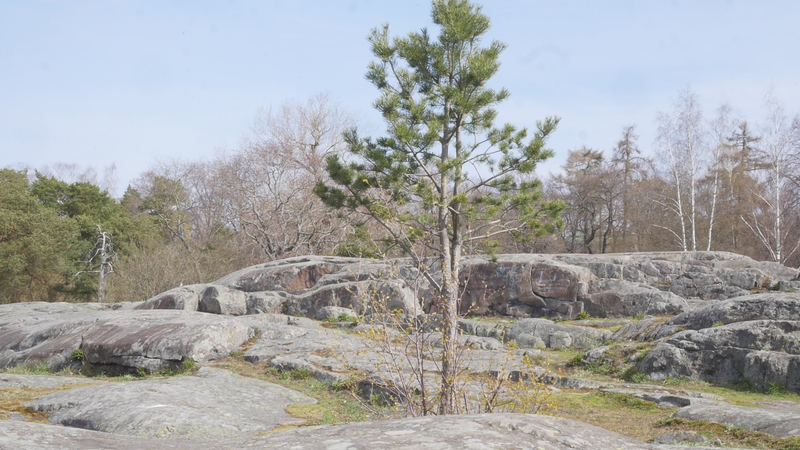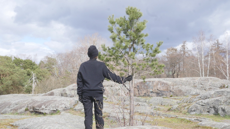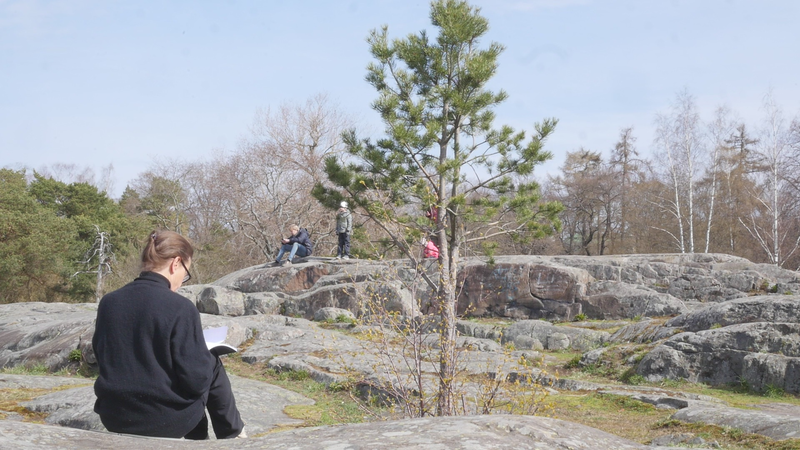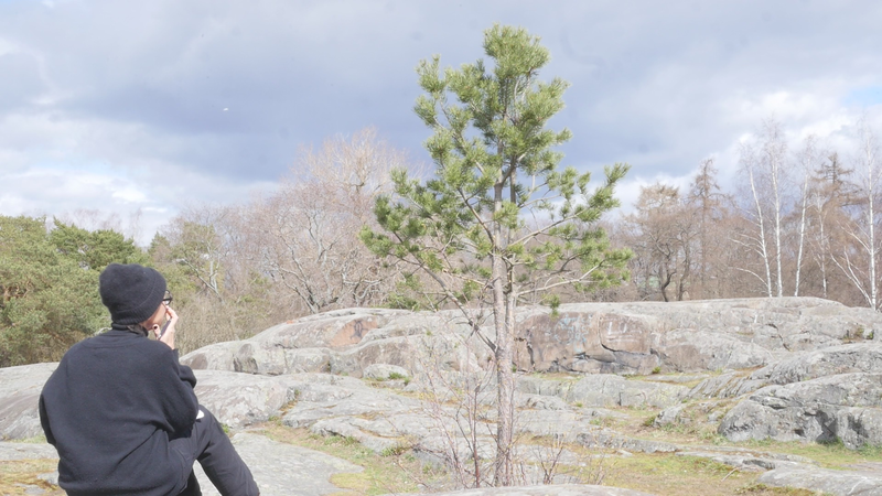 Kära tall, trevligt att se dig igen! Jag var här för ett par dagar sedan, men vädret var varmt och soligt och det var fullt med folk här. Du hade andra besökare som satt alldeles intill så jag ville inte störa dig, försökte inte ens. Och besöket dessförinnan slutade snöpligt med att kamerastativet blåste omkull. Idag blåser det igen, inte så mycket, men här uppe på berget känns varje liten vindpust. Nu har jag en tyngd hängande från stativet – en stor sten inne i kameraväskan hängande nära marken – så de borde vara ok med kameran. Men folk är det fullt av fortfarande. Just nu promenerade ett par tvärs igenom bilden, och till vänster om mig, längre ner på sluttningen, sitter en familj på picknik. Men i princip tror jag nog att vi får vara i fred en stund. – Jag har faktiskt saknat dig, vilket kan låta konstigt, för vi har ju knappt lärt känna varandra, eller jag lärt känna dig – vad du har upplevt visavi mig, vill jag inte spekulera om. Men jag tror att det beror på att jag saknar tallen på Hundudden i Stockholm, som jag inte sett sedan januari, och du är ett slags ställföreträdare för den. Jag hoppas att du inte tar illa upp för att jag betraktar sig som en ställföreträdare, men så kan det ju bli i mänskorelationer också. Någon som först känns som en ställföreträdare, en ”placeholder”, blir med tiden en riktig vän. Jag hoppas det blir så med oss. Och jag börjar lära mig så småningom, lära mig villkoren för våra möten: det får inte vara för varmt eller soligt, inte weekend, antagligen inte lunchrast heller. Och inte alltför blåsigt. De här villkoren handlar egentligen mera om platsen du lever på än om dig i sig, och så brukar det vara med träd. Det går inte att skilja på dig och ditt liv, din omgivning, vill säga. Vi människor tror, eller jag tror i varje fall, ibland, att det skulle gå att skilja på människorna och deras liv, eller en speciell person och platsen eller platserna den lever i och på, men det är ofta en illusion. Vi är där vi bor, inte bara vad vi äter utan hur och var vi lever… Det blir särskilt tydligt nu under Corona-krisen då alla tillbringar en stor del av sin tid hemma. Men om man uppfattar platsen lite vidare, som det historiska och geografiska sammanhang man lever i, tror jag att det stämmer ganska långt. – Ja, nu börjar jag tala om människor igen, förlåt om jag tråkar ut dig! Vi är (eller åtminstone jag är) så självupptagna ibland. Jag har ju inte ens frågat hur du haft det? Hur du mår? Jag tycker mig se att du mår ganska bra, men det ä ju bara min tolkning. Du förändras inte märkbart från gång till gång. Den lilla björken intill dig, däremot, håller på att slå ut sina blad, man kan nästan se dem växa, men bara nästan! Nu när solen kom fram känns det genast varmare, men vinden är fortfarande lika kall. – Gör jag fel att skriva till dig på det här sättet? Jag menar, det skadar ju inte dig, men är det en villfarelse, en illusion, en löjlig lek som får mig att inbilla mig att ett jag-du -förhållande à la Buber eller Levinas skulle vara möjligt mellan oss. Men jag inbillar mig kanske inte det egentligen – jag ser det här som en övning, en övning i att fokusera om… Tack för att du har tålamod med mina försök, och ha det bra tills nästa gång! Sköt om dig!
