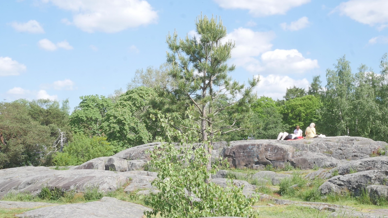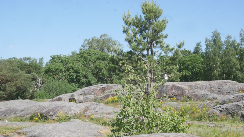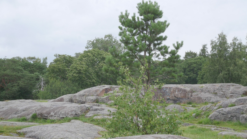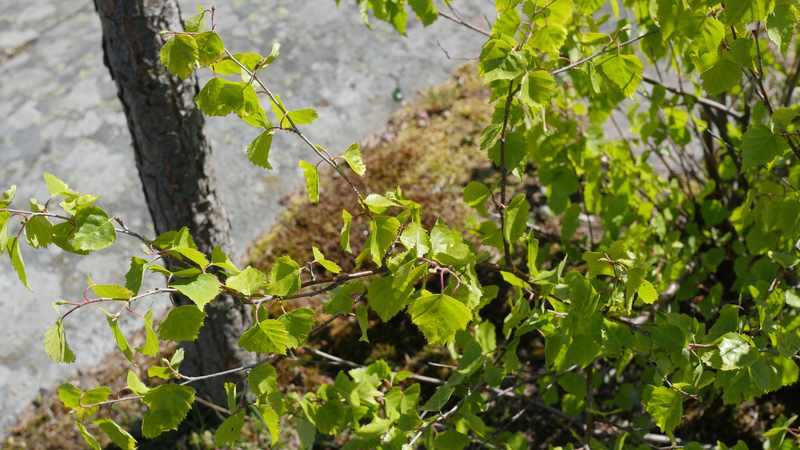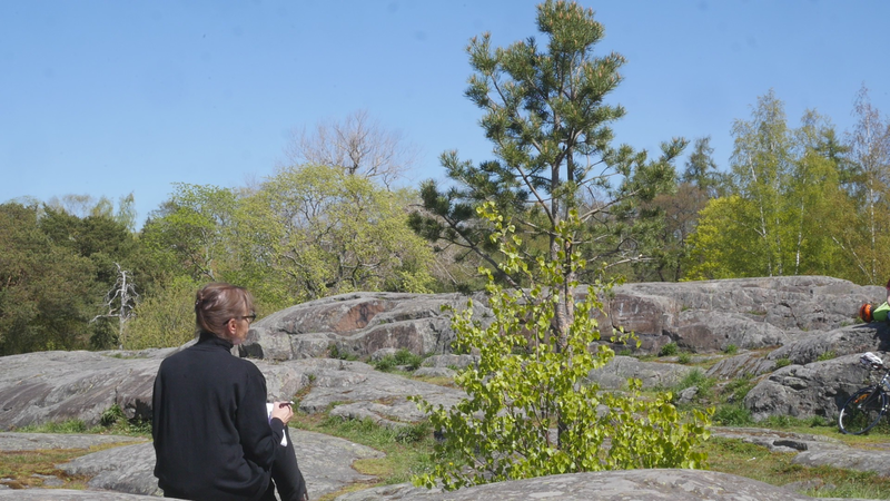 Kära tall, trevligt att se dig igen, efter en paus på flera veckor. Nu är det full sommar och du försvinner nästan i den allmänna grönskan, ifall jag borde välja ett träd att stifta bekantskap med idag, skulle jag kanske inte lägga märke till, så tur nog började jag medan det ännu var vårvinter. Du ser ut som förut, de nya skotten för i år är stora och gröna och smälter nästan samman i ditt lövverk – tja, lövverk kan man kanske inte kalla det – och barr-verk låter lite konstigt, så skall vi försöka med krona, då? -den lilla björken intill, har ett frodigt lövverk och tar stor plats åtminstone visuellt. Men det går ingen nöd på dig, tycks det som, och just nu är ju allt så bra det kan vara, varmt och soligt, rikligt med regn för bara några dagar sedan, tillräckligt med vind för att hålla dam och kanske en del småkryp borta… Vad i övrigt skulle du önska dig? En renare luft? Mera näringsrik jord på berghällen? Just nu har du till och med lugn och ro, nästan. En ung kvinna ligger och solbadar på berget alldeles bakom mig. Och jag var tvungen att placera kamerastativet nästan på hennes badhandduk, men hon var jovial. Rakt framför mig sitter en grupp kvinnor på picknick, och de känner sig kanske utpekade i och med att kameran pekar mot dem, men i dagens värld är bilder en sådan bruksvara att ingen tycks riktigt bry sig.