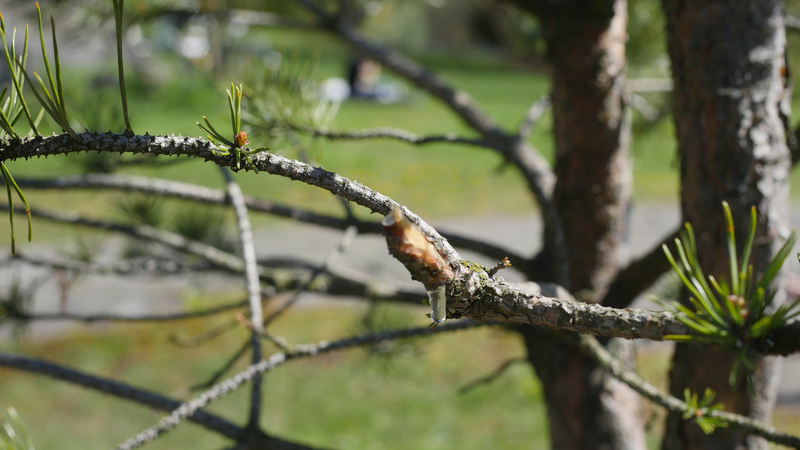 Hej igen, det var länge sen sist. Jag har varit här ett par gånger de senaste veckorna, men det ha suttit någon alldeles intill dig båda gångerna. Även nu är det två picknic sällskap alldeles här intill, men av en slump kom de inte med på bild. Den gruppen som sitter här intill hörs antagligen på videon. Men det är paret i bakgrunden som jag trodde skulle komma på bild, men jag misstog mig. De sitter just utanför bildgränsen. Men jag frågade dem i varje fall ifall det var okej, och de sa att de inte brydde sig. – Men du, då? Bryr du dig? Synbarligen inte. Du ser ut nästan som förut, med undantag av den avbrutna gren, vars ”sår” inte längre lyser lika vit. (När jag såg efter senare, märkte jag den stora droppen kåda som runnit och stelnat för att läka såret) Och så har du nya skott, något som liknar blommor eller blivande kottar eller motsvarande, på ändan av varje gren. Jag skall ta en bild på dem efter vår skrivsession. Vår skrivsession? Hm. Min skrivsession hos dig, skall jag väl kalla det. Nu hör jag ett sällskap bakom mig också. Det är ungefär lunchdags och lördag, så det är klart att det är fullt med folk - solsken och varmt. En av de vackraste dagarna den här våren, med riktig sommarvärme. De har lovat att det skall bli tjugo grader på eftermiddagen. För din del betyder det antagligen att du avdunstar mera vatten för att inte bli för varm, och kanske du får lov att suga upp mera vatten från marken också. Björken intill dig, som nu har stora löv, lite gulgröna ännu, men i övrigt nästan ”fullvuxna”, har i varje fall ett system i sina blad där den har öppna ”gluggar” för att släppa ut vatten att avdunsta, eller hur är det egentligen enligt den nyaste forskningen. Mina grundkunskaper kan faktiskt vara helt föråldrade. Jag vet inte om barr är lika lätta att reglera enligt ljus och fuktighet och fotosyntes, men i princip borde de ju fungera lika, trots att de har en annan form och är tänkta att hålla längre än löv, som här i norr fungerar för en sommar. Men visst tappar du ju barr också, men inte så strukturerat, en viss tid på hösten. Kanske det är mera som när jag tappar hår, lite då och då…
