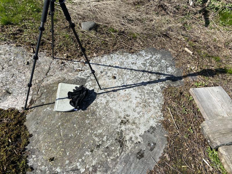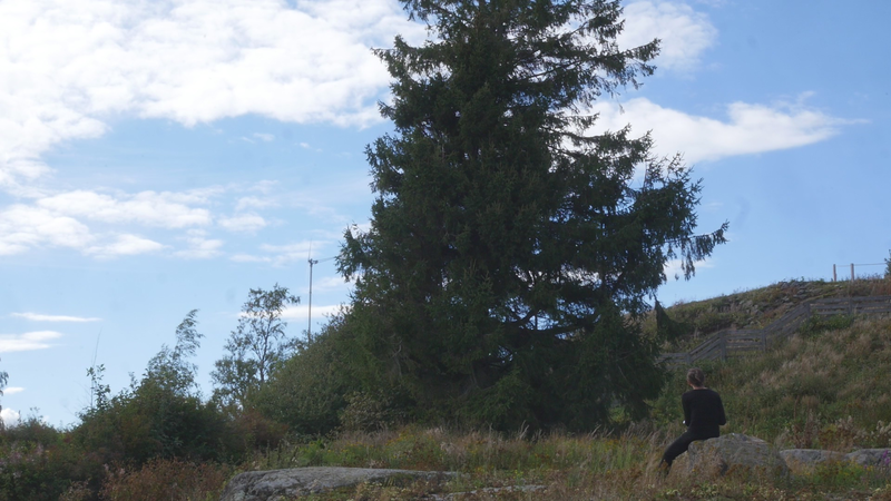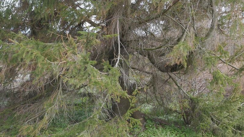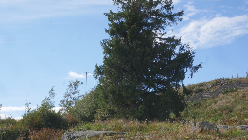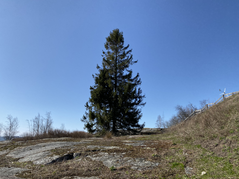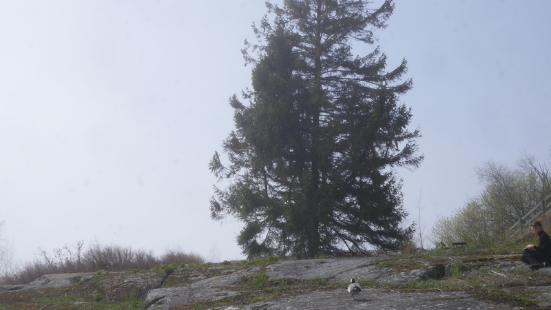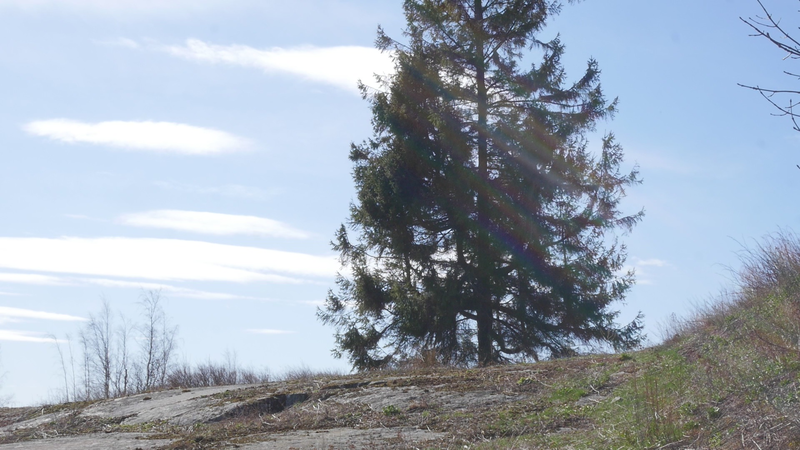 Dear Spruce, nice to see you again, and now from a new perspective. In order to get all of you into the image – that is the part growing above ground – I had to move the camera rather far to southwest. And therefore, I am sitting at some distance from you as well, in order to be visible in the image and still sit on the rock. Actually, I am sitting almost in the midst of the path, which here disappears into the rock, but right now that does not matter because there are not many people around. A few of them are doing something near the pile of brushwood further east; otherwise, there are mainly seagulls and geese, as you can hear from the image. Moreover, it is unusually calm, some clouds gather slowly, but they are light summer clouds, so far. In the distance one can hear the sound of motorboats, a crow caws somewhere. I do not know the sounds of birds, although I know there are others here, besides seagulls and terns), geese and crows. The oystercatchers have a particular sound, although they often found close to the shore. Can you hear the sounds of birds? Perhaps they are of no importance to you. Researchers have discovered, however, that plants can recognize for example the sound of running water, and that makes sense of course. You stand there with your double crown (although one cannot see it from this direction) regardless of whether there is water nearby or not, perhaps because the ground right here is fairly humid. And an enormous number of daffodils or easter lilies, which soon will blossom, grow at your roots - even though easter is already over this year. Part of your branches look withered, perhaps you do suffer from drought after all. You are handsome, however, growing tall; if not sheltered by the slope your height would probably seem even more enormous. Your upward turning branches are somehow strange, I have not seen such branches in other spruces. The branches can bend, of course, but to turn and grow vertical like extra trunks or alternative crowns, that I cannot remember seeing before. – You are constantly moving a little bit, as if dancing with the wind, slightly, gently and lightly. Is it pleasurable for you or are you adapting to the fact that the wind is brandishing your branches only because you are forced to? Does keeping your balance require much work? Human muscles are ceaselessly working to maintain vertical posture and that is probably the case with you as well. – Here my pen decided to end (or run out) and I returned to the camera to find another pen in my bag. Our “conversation” was thus suddenly interrupted. Hopefully we will meet again soon. All the best to you until then! And thank you again!