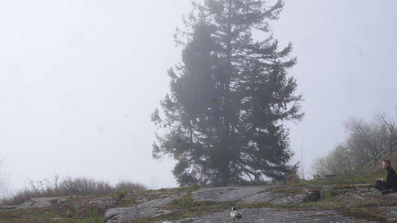 Dear Spruce, great to see you again in this strange weather. The wind has brought from the sea a funny fog that covers everything in a pale mist, even though the sun is shining. Your branches are swinging in the wind and tiny droplets are floating in the air, which they probably like – a kind of miniature shower. I notice how the drops blur my spectacles and create stains in the paper. My main worry, however, is the male goose, who guards me closely, because on the other side of the small mound a mother goose is probably hatching in her nest. There it was at least last time, when I tried to approach you from this direction. While sitting here I cannot see it. Perhaps the nesting did not succeed, although why would the male goose swagger around here, with such importance, if the lady of the house would not sit in her place? A strange weather in any case, and the wind is cold. This moisture is of course good for you, it wipes away the winter dust – although the island is usually such a windy place that much dust has hardly gathered on your branches. It is May and I imagined the changeable weather and cold spells of April to be over, behind us. But sometimes there has been hail in midsummer. This misty landscape is kind of amazingly fine, I don’t know if the camera can see it, and you are standing so rugged on your own, that there are near you none of those pale green thin branches, which the mist makes so magic. How have you been lately? Is the sap rising in your trunk as it does in birches, even though you are not creating a completely new foliage? Some kind of spruce sprouts, new spots of growth at the tips of your branches you, too, will probably create? – Today the wind is so cold that I will not stay here for very long. I hope you don’t mind if I don’t remain in your company for a longer time? And why would you mind? I am sitting here on the ground, far from your roots, on the rock between patches of moss. You probably hardly notice my presence, when I have difficulty in sensing your presence, even though you are so big and handsome, and dominate the landscape like an autocrat. No. I am not going to speak about your solitude, why go on about that. Everyone has to adapt to the limitations they have received through the time and place of their birth. And in that respect, you are a real epitome and example – to grow on a rocky islet in the midst of humans and birds up to that height, that is quite an achievement! Now, speaking of achievements, I have reached the endpoint of my adaptation, I simply cannot huddle here any longer, but will go indoors for some warmth and come back to you another day when the wind is milder. Be well until then and thank you again!