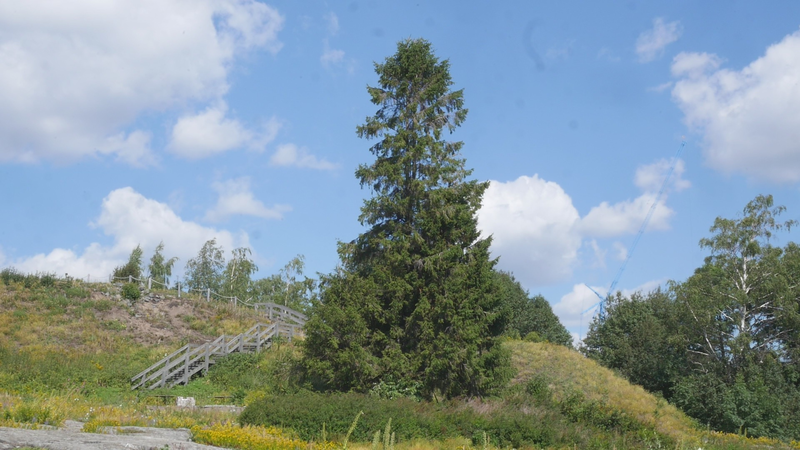 This is nevertheless the first time when I approach you from up on the slope, from below the panorama spot. The path and the stairs on the right, which lead to the southern rocks of the island are still closed to let the birds keep nesting in peace, although basically almost all the nests are already empty. Here where I am sitting now a big grey seagull chick was strutting along a moment ago; otherwise, there is nobody in sight. Only a few weeks ago several goose mothers were sitting on the slope hatching, while now there are only some dips and feathers left. Not even goose couples strutting around with their small fluffy young are any longer to be seen. Thus, I will soon be able to come closer to visit you. Now white mallows or phlox are blossoming around you, from here I cannot distinguish them, but I think I remember they were mallows, and right at your roots, in the shade, the fireweeds, of course. On the eastern side the mix with the foxgloves. – The traditional insect researchers have placed their trap lamp rather high up on your branch, on this northern side. I don’t remember seeing it before, probably because I looked at you from the other side. Tourists are moving on the rocks, despite the prohibitions. Perhaps they have ended there via another path… And the wind is rising. Everything is dry. The slope where I sit is completely bone-dry, almost mere dust. I don’t comprehend how the plants an make it, although perhaps even the small ones have deep roots that can find water in the ground. Where I sit the coppice of birches is cut very close to the ground, probably to maintain the terrain relatively open. Actually, I am sitting here on the roof of the ammunition cellar, I assume. I just tried to photograph the view towards the city from the panorama spot and realized it is completely overgrown. Luckily the view towards the sea is still open. I don’t know whether the eutrophication of the island has any crucial influence on your life. From southeast the alders are expanding to compete for the rich soil in the former garden, although they also fertilize the soil by binding nitrogen or something, if I remember correctly. At least you do not seem to be bothered by the drought. If you can survive the autumn storms and the winter colds, a few weeks of a heatwave is hardly a problem for you. – In some way you seem even bigger when observed from higher up on the slope. Your branches are swinging in the wind, but your trunk does not waver. And your crown, which is divided in two, seems especially dense because of that. Unlike many spruces with thin elongated crowns, you crown is dense and broad, as it is double, and looks rounder than usual anyway. – The seagulls keep shrieking. They do not mind me, I guess, but the other passers-by. Or then they make noise simply to remind each other that they exist. You are silent. If sitting closer I would hear how you wuther, although it is really the sound of the wind, not you. Scientists have examined the sounds or utterances of plants, and they do send some kind of snaps or clicks or the like, and they hear the sound of water! Whether than concerns spruces, I don’t know. Great to see you after such a long time, in any case, and although I do not have any important news for you – perhaps one could consider news the fact that the heat wave will give way to cooler weather and they have promised rain for tomorrow night. Well, you can have a shower soon. – All the best to you for the coming days, and hopefully we will meet more frequently in July. Take care and thank you again!