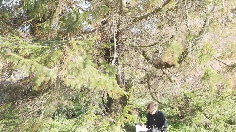 Dear Spruce, or should I say beloved Spruce? Great to see you again! My aim was to come and visit you in the same spot as last time, on the rocky slope to the east, but as it turned out what I tried to avoid had happened. Close to the spot where I sat last time there was now a goose mother sitting in her nest, and when I approached a worried looking male goose headed towards me. It was not enraged with its tongue out, but nevertheless tried to show that it was not a good idea to go there. I probably could have sat relatively close to my former spot but gave up trying; I did not want to pick a fight nor become nervous for nothing myself. I was about to turn away when I realized I could choose another perspective and another spot to visit near you. Considering the northwesterly wind, it would be relatively convenient to sit anywhere near you, because the hill formed by the cellar roof would serve as a partial wind protection. From the east you would be almost in backlight at this time of the afternoon. Thus, I willingly changed my place. Now the camera is placed on the old rock platform on the same side as the path, and I am sitting on the ground right next to you, quite close to the spot where I sat weekly during the year of the pig 2008, although at that time I had a stool to sit on with me, and I think your branches were hanging lower hiding me almost completely from passers-by. I cannot see any marks of branches on your trunk; your dry lower branches have not been cut. Perhaps you have simply grown taller during these twelve years, and moreover the thick branch on the western side has turned to grow almost vertically, as a second crown or trunk. Last time I wondered why you don’t have any offspring and noticed that you have no cones. Now I am thinking of the rather humid soil around you, unlike the soil elsewhere on the rocks. Right next to me blue and white snowdrops are blossoming and to the left behind me the first daffodils and narcissuses are about to burst forth. When I look at your branches behind me, I notice that the lowest branches have dropped their needles and dried out, at least for the most part. That is the reason why I am no longer hidden when sitting beneath you like before. – For some reason it is difficult to find the right way to address you, it feels like writing to myself. Or is it because I cannot contain myself and listen? When I listen to the sound around me, I hear first of all the howling of the windmill and the quacking of the geese; now is the time when they have to find out where to make their nests. Once in a while the seagulls cry intermixed with them. And your branches are rushing, too, all the while. The sound comes from so high up I do not always realize that it is your branches which really buzz. Sometimes I think I should develop some kind of more systematic practice of listening, or sensing, otherwise this meeting will not become a dialogue or a mutual encounter in any way. On the one hand the reason for writing to you is trying to find alternative ways of spending time together without demanding you to do anything, not even to notice me. I have sometimes tried to speak in your name, or not exactly your name, but in the name of some other trees on this island as well, in some sense performed as a tree, or playfully claimed I was a tree; in fiction you can do that. On the other hand, I thought we could perform together for the camera and by video recording you both from a distance and further away and also from beneath you, through your branches, I tried to focus attention on you. Now I try to do that by addressing you. Thus, I do not speak on behalf of you or in your name, neither do I try to make you speak with the help some specific technology, nor record and interpret your “speech” in a way that I or the human ear in general can hear. I do not ask you to draw with the help of the wind, nor transform the processes of evaporating water or your electromagnetic reactions to sounds and so on. This kind of addressing will easily turn into a soliloquy, although that is not the aim. Therefore, I have to develop some habit or rule to help me in listening to you, in sensing your way of existing. Perhaps we can save that for next time. Now I feel my legs getting numb sitting here beneath you and the geese around me are quaking forcefully, demanding all the attention. Perhaps next time I find a new spot next to you, or a new point of view e to approach you. Until then – be well! And thank you for this moment at the threshold of spring…