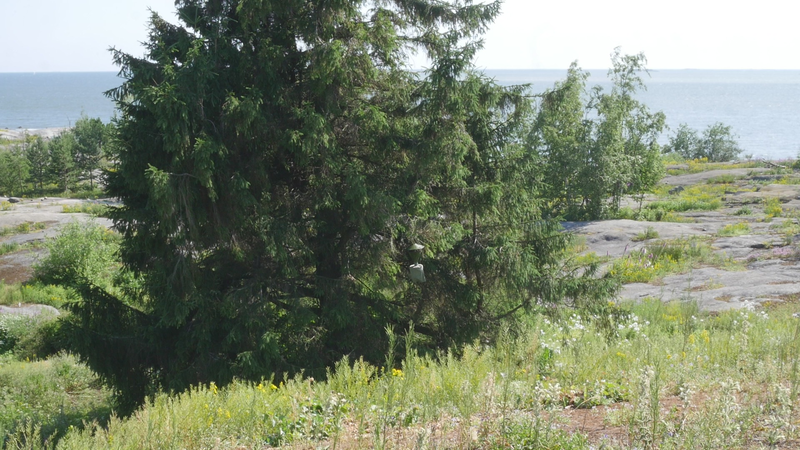 Dear Spruce, nice to see you again – it has been a long time since – and from a new direction. I am sitting on the rocks to the south from you, or rather between south and southwest. Only a few weeks ago this area was protected and reserved for nesting birds. Right next to me is clearly a former nest and it is sheltered by the edge of the rock. Now there are not even young seagulls anywhere and the landscape is surprisingly silent. Or then not, because just now the rather strong sound of a motor finally lessened and I can hear the sound of another, albeit smaller motorboat approaching and moving away. When I came to the rocks, I saw an elderly lady or should I say an aging woman hanging an insect lamp on your branch on the northern side. It is not visible from here, but from the panorama spot it is clearly distinguishable. She turned out to be the daughter of the scientist couple who has collected insects on the island since the end of the eighties who was “checking the nets”, that is emptying the insects from the traps. I don’t know if it is only the light of the lamp that lures the insects into the trap at night or is there something else alluring in the container below the lamp. This is the first year, if I remember correctly - at least for some time – when the lamp is fastened on your branch. There may be several of them around the island and the one on your branch hangs rather high up. Considered in relation to your height it is of course rather low. The tower construction for bungee jumping which stretches blue towards the clouds behind you, is more of the same “calibre. It is a clear sign of reaching the end of summer. Usually, I associate it with August. At that time a floating platform arrives to the shore of Kaivopuisto Park, near the peer, and on the shore stands a huge vehicle from which the bungee-tower rises. Placed right next to you it would certainly be higher but sitting here you stand in the foreground and fill most of my field of view. It is so calm that you sway almost imperceptibly, your upper branches move slowly and your lower branches seem to be swinging softly. You are probably enjoying the light, although it means work for you, but I don’t know if this heat is pleasurable for you or not. You hardly enjoy too hot weather, since you manage to live high up in the north. While not being sure of it, I imagine most of Siberia consisting of spruce trees, could it be? The forest part, that is. Seen from here you look really hefty, and it is not as clear that you are two, if we think in terms of the crowns. Perhaps it is wiser, however, to think in terms roots, and in that case two crowns is no bigger deal than a few more branches, or something. I would like to ask how you are doing [in Finnish literally ‘what do you hear’]? But that feels funny. Quite literally you probably can hear partly the same as I do, the sound of motorboats, which drown all other sounds. Only the shrieking of seagulls can beat them. – I am now on the island daily, as a gallery sitter, and additionally visiting a small pine tree on the shore during the month of July. Thus, I am walking past you every day, but only now did I manage to sit down here with you for a while. And in order to fit all of you into the image frame, the above ground part, I sit here on the rock rather far away from you. Your presence is felt strong, however, all the way to here, because you are one of a kind and right there in a lovely manner, seemingly the same as always. In my eyes you look like you did twenty years ago, although I know that you, too, keep changing and growing all the time as other plants and everything living. It is nevertheless great that you are there exactly the way you are. Thank you for that, and see you soon again…