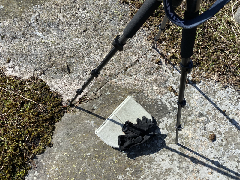 Rakas Kuusi, hauska nähdä taas, ja nyt uudesta kulmasta. Jotta voisin saada sinut kuvaan kokonaan – siis maan yläpuolella kasvavan osan sinusta – jouduin siirtämään kameran aika kauas lounaaseen. Ja niin myös istun melko kaukana sinusta, jotta näkyisin kuvassa mutta voisin silti istua kalliolla. Käytännössä istun lähestulkoon keskellä polkua, joka tässä kohtaa katoaa kallioihin, mutta juuri nyt se ei haittaa, sillä täällä ei ole paljoa väkeä. Pari ihmistä puuhaa idempänä risukasojen luona, mutta muuten täällä on lähinnä lokkeja ja hanhia, kuten kuvasta kuuluu. Lisäksi on harvinaisen tyyntä, pilviä kerääntyy hiljakseen, mutta ne ovat poutapilviä, toistaiseksi. Kauempaa kuuluu moottoriveneiden ääniä, variskin raakkuu jossakin. En tunne lintujen ääniä, mutta tiedän, että täällä on muitakin kuin lokit ja tiirat, hanhet ja varikset. Meriharakoilla on omanlaisensa ääni, mutta ne ovat usein lähempänä rantaa. En tiedä kuuletko lintujen äänet? Ehkä niillä ei ole sinulle merkitystä. Mutta tutkijat ovat havainneet, että kasvit voivat kyllä tunnistaa esimerkiksi solisevan veden äänen, ja siinä on tietysti järkeä. Sinä seisot siinä kaksilatvaisena (vaikkei se näy tästä suunnasta) oli lähelläsi vettä tai ei, ehkä koska maasto on juuri tässä aika kosteaa. Ja juurellasi kasvaa valtava määrä pääsiäisliljoja, jotka kohta puhkeavat kukkaan – vaikka pääsiäinen onkin tältä vuodelta ohi. Osa oksistasi näyttää kuivahtaneilta, ehkä kärsit kuivuudesta sittenkin. Mutta olet kyllä komea korkeana kasvaessasi, ellet olisi rinteen suojassa mittasi tuntuisi varmaan vieläkin hurjemmalta. Ylöspäin kääntyvät oksasi ovat jotenkin outoja, en ole nähnyt sellaisia muissa kuusissa. Tietysti oksat voivat kaartua, mutta että ne kääntyvät kasvamaan kohtisuoraan ylöspäin kuin ylimääräisinä runkoina tai mahdollisina vaihtoehtoisina latvuksina, sitä en muista nähneeni. – Olet koko ajan pienessä liikkeessä, ikään kuin tanssit tuulen kanssa, hiukan, hellävaroin ja kevyesti. Onko se sinusta nautinnollista, vai sopeudutko siihen, että tuuli heiluttelee oksiasi vain väkipakosta? Vaatiiko tasapainon säilyttäminen paljon työtä? Ihmisen lihakset työskentelevät herkeämättä pitäen pystyasennon, ja niin on varmaan sinunkin kohdallasi. – Tähän kynäni päätti lopettaa (tai loppua), joten palasin kameran luokse ja löysin laukustani toisen kynän. Tämänkertainen ”keskustelumme” katkesi siis yllättäen. Toivottavasti tapaamme taas kohta. Kaikkea hyvää sinulle siihen saakka! Ja kiitos taas!