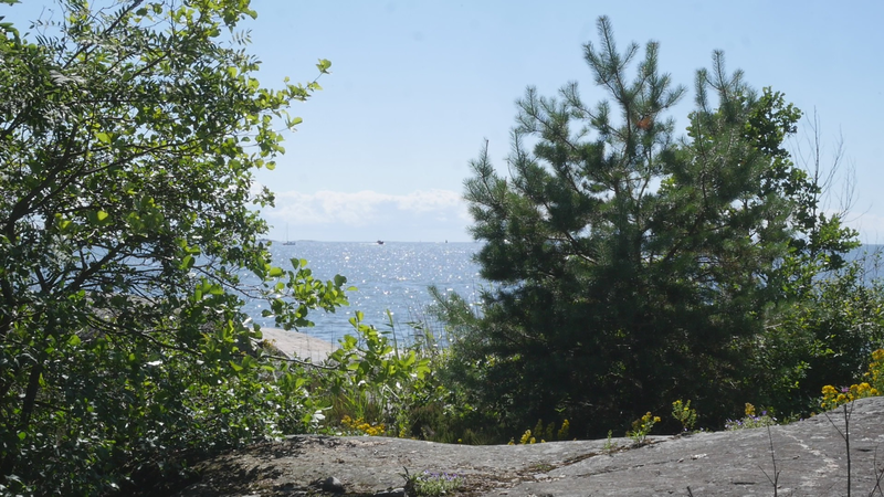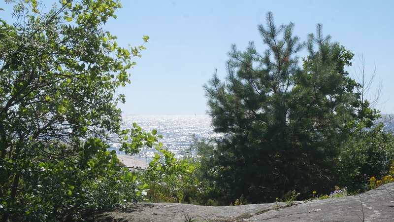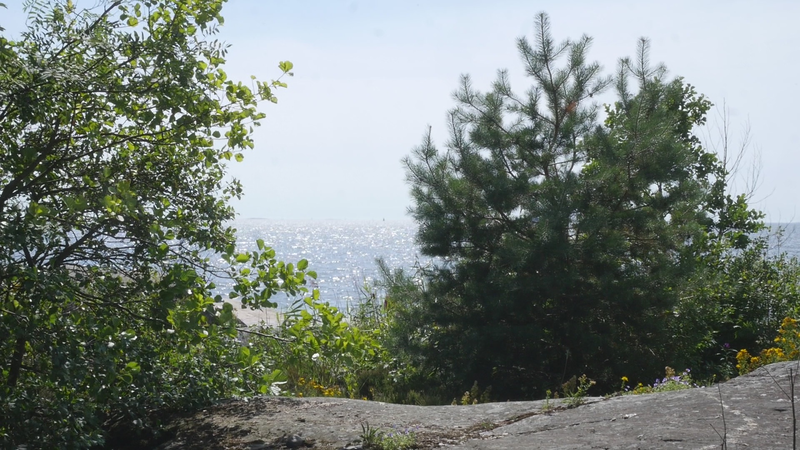 Hieno hellepäivä, meri kimaltelee ja kuhisee kaikenkokoisia veneitä. Saarellakin on turisteja, perheitä retkeilemässä siellä täällä. Yksi aivan lähellä kuvauspaikkaani, mutta kallion kumpareen takana. Kuulin äänet, ja seistessäni männyn vieressä näin heistä osan, toisin kuin kamera taaempana. Löysin uuden reitin männyn luokse, suoraan kallioiden yli, vain yksi pieni kosteikkokohta. Syyskesän kukat rehottavat täysillä, kaikki kukkii yhä aikaisemmin.