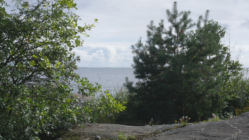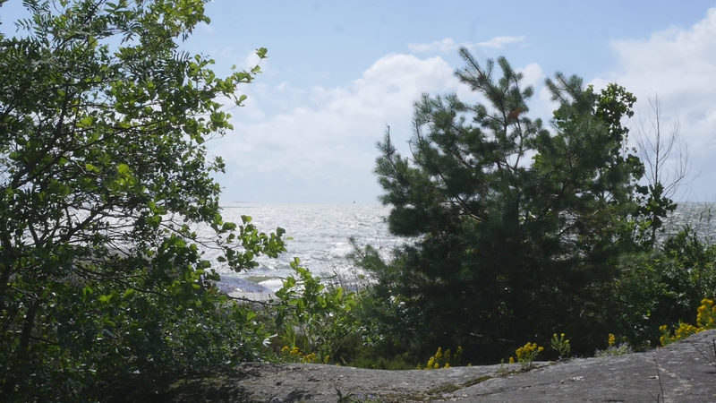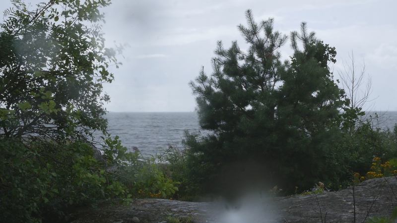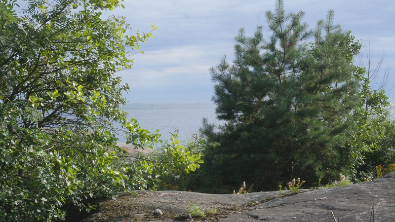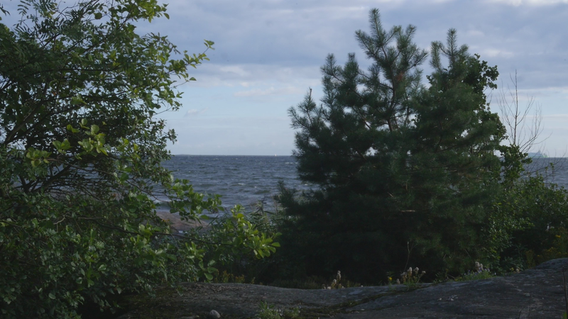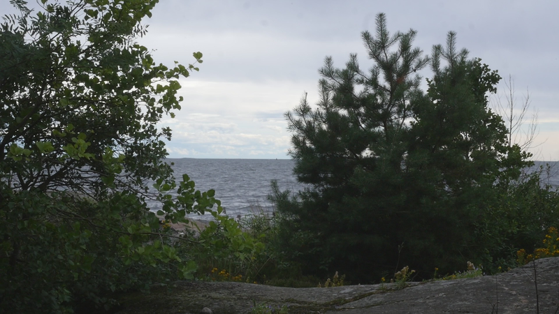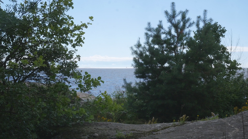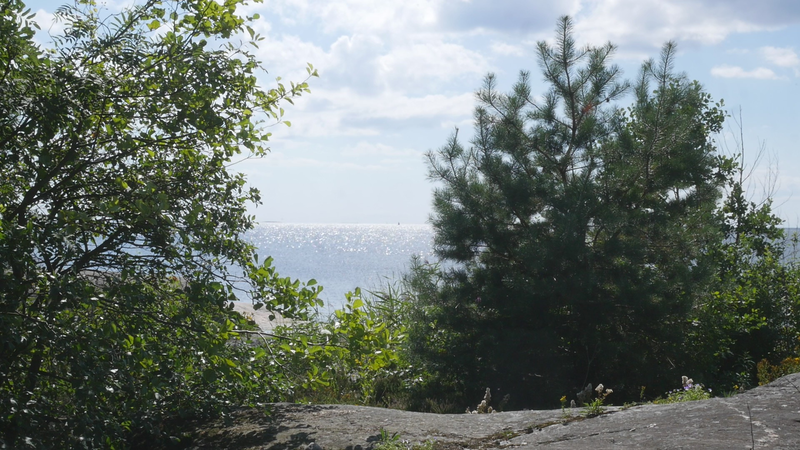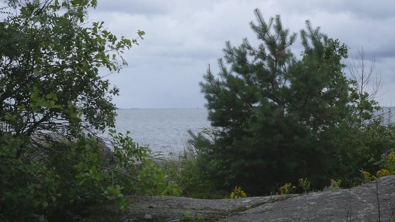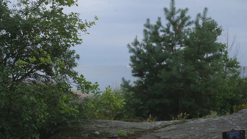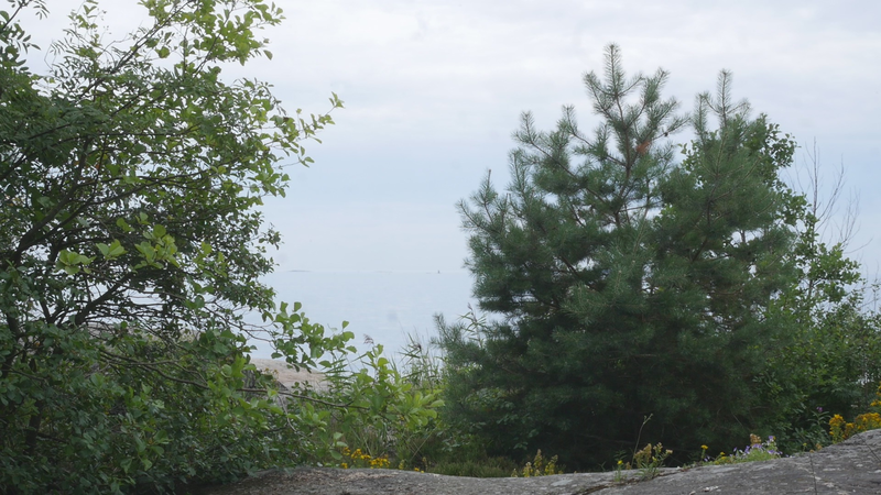 Vesi valuu kallioilla aamupäivän sateen jälkeen, kosteikkopaikat ovat nyt lätäköitä. Navakka tuuli ajaa vaahtopäitä lännestä, viisto valo katoaa välillä pilvien taakse, ilta tummenee. Seison männyn vierellä kahteen kertaan, sillä ensimmäisellä kerralla tuuli tönäisee kameraa sivusuunnassa ja muuttaa kuvan rajauksen. Kun palatessa astun paljain jaloin kalliolle, se tuntuu kylmältä.