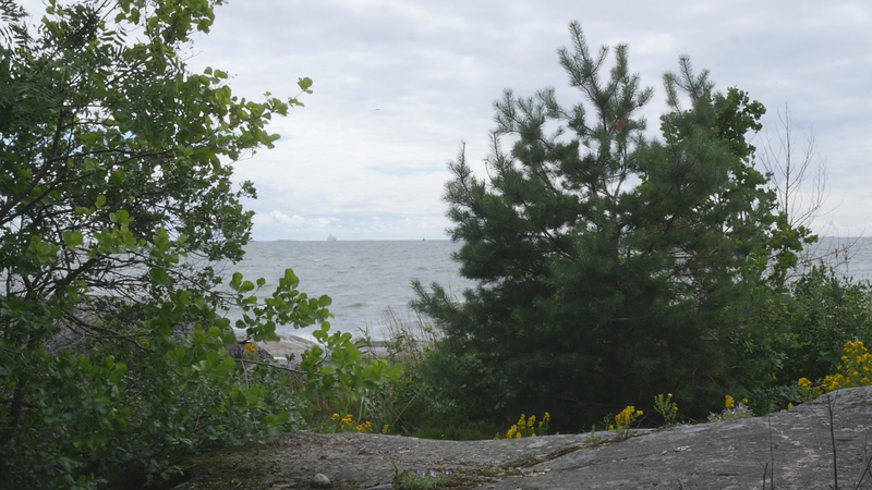 Outo ilma, ohut harmaa pilvipeite, tyyntä, lämmintä. Meri on rauhallinen, harmaa. Horisonttia ei erota. Rantaan tullessani kuulen ihmisääniä, ja luulen ensin, että kuvittelen. Ei, perhe bunkkerin luona keskustelee näkemästään ja pian lapset kipittävät rantakallioilla edessäni. Kamera tuskin huomaa niitä. Sitten laivan sumutorvi, tyynellä säällä äänet korostuvat. Liikenne vesillä on rauhoittunut, viikonloppuveneilijät ovat poissa.