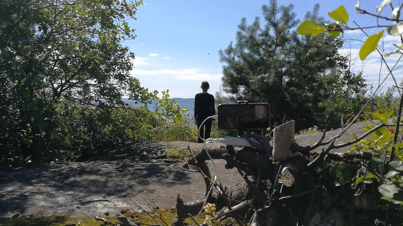 Sadepäivä, tyyntä, harmaata – juuri nyt ei sada. Lähden männyn luokse puhelin mukanani, lauantaina esiinnymme yhdessä verkkotapahtumassa tunnin ajan. Haluan kokeilla minkälaisen kuvan voin saada aikaan puhelimella. En tajunnut, että se näkyy videolla, oikeassa alakulmassa. Kokeilin useampaa paikkaa, ja otin myös ison kameran jalustan avuksi. Onnistuin kaiken kukkuraksi kaatamaan kameran lätäkköön – onneksi se ei ollut merivettä.
