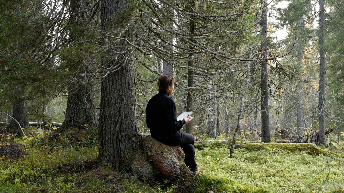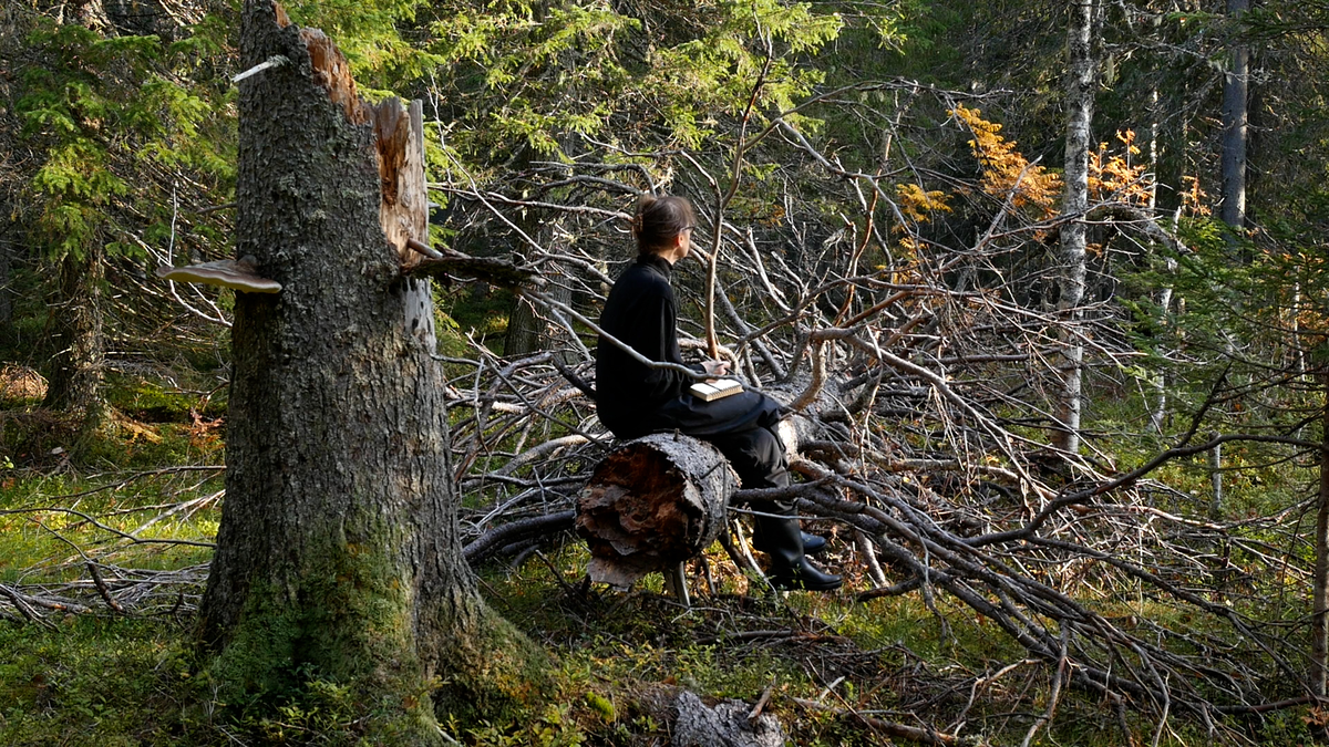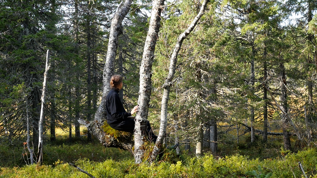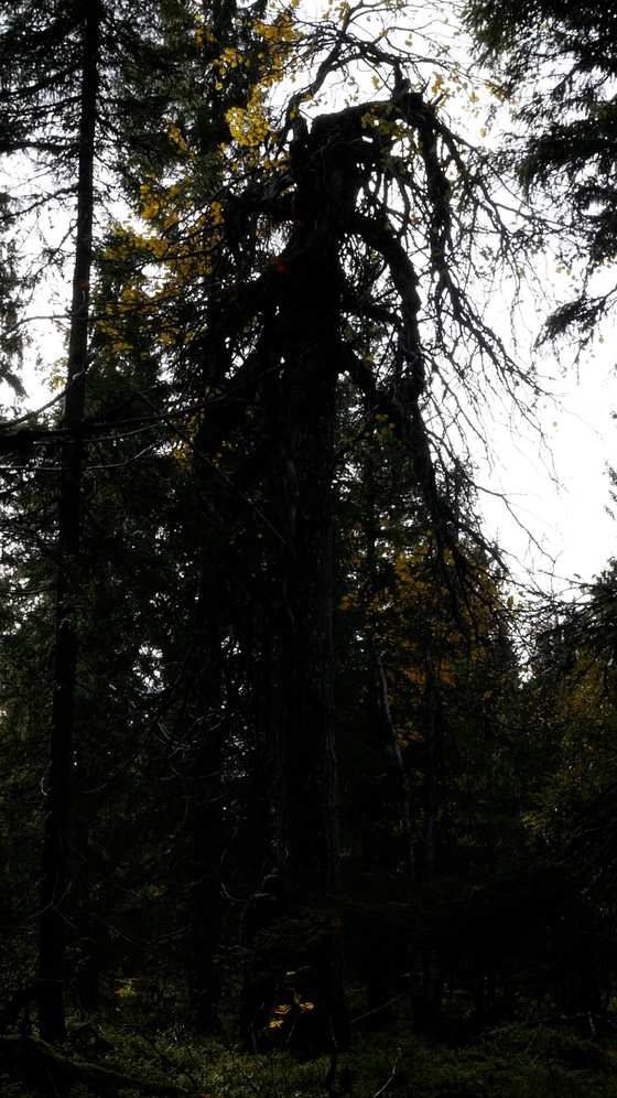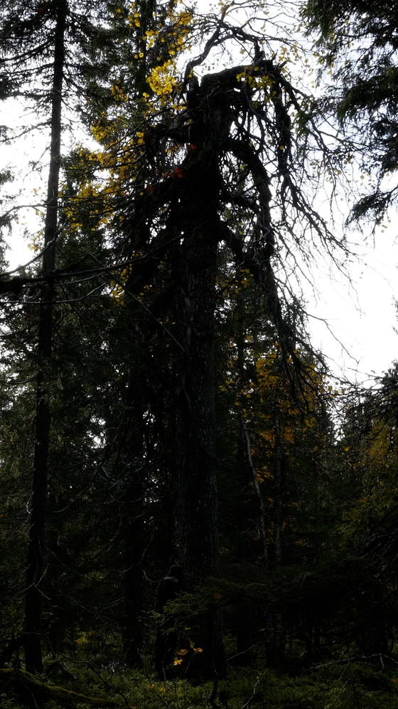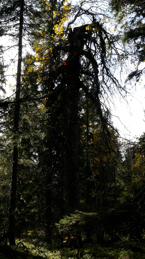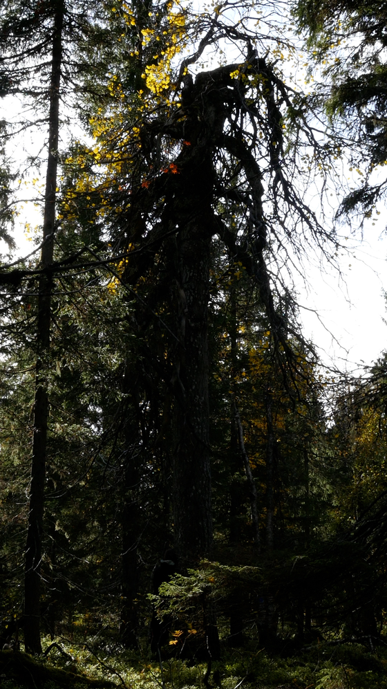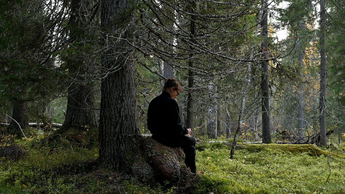 Nice to meet like this, accidentally, on the path. I was on my way to visit the deceased spruce tree nearby when I suddenly noticed the soft green moss that grows on your trunk at the point where it is divided into several branches, almost like a small comfortable armchair, really. And the sun was shining on it in such an inviting way that I decided to sit down for a moment in front of the camera and write a few words to you. Perhaps you find it strange that I address you in Swedish here in the heart of Finnish Kainuu, where the next language after Finnish or the local dialect probably would be Russian – or then English or German or even Czech that some of the guests in the Mustarinda house nearby probably speak if they happen to pass by here. I choose to write to you in Swedish, however, not so much for our sake but for my own sake, to see how it feels. Because, honestly speaking, I don’t think it matters to you what language I write. What perhaps, possibly and hopefully matters is whether I manage to articulate my thoughts with the help of writing or not. So far, I have only chatted away in order to get going. Do I have something to tell you or even something to tell myself right here, right now today? This is my last day in Mustarinda, my last day in this old silent forest that I have learned to love, with its thick soft moss, the many dead trees lying here and there and the fresh air, which is so soft and lovely to breath. I know I am going to miss this forest, and I will try to visit forests closer to me, later. I hope you enjoy your living quarters here next to the path and near the bog that opens immediately on the other side. You have two painted slashes of colour on one of your trunks, a blue and a green one, to indicate the two paths that are here merged and divide into separate paths a bit further on. You have lived here for quite a while, I suppose, although you are not exactly an old one. Perhaps you are older than your looks if there has been a shortage of light or nutrients here; or then you are not that old but look older due to the cold winters with heavy snow, which has damaged many of the spruces here. Because you shed your leaves it is not as dangerous for you, I guess; your bare branches are not gathering such heavy burdens that would then break them. But the moss I am sitting on involves another kind of risk. If it will gather moisture, there will be rot and you might actually fall in two pieces with time. That can sometimes happen old trees, which have a forked branch or a divided trunk. Forgive me for sounding like a jinx, I think you are perfectly fine here and as far as I can see there is nothing wrong with you. On the contrary, I should be grateful for the moss that you carry, because despite being rather wet it is soft and pleasant to sit on, like a cushion intended for passers-by. Yes, I know it is not intended for that and I suppose you would prefer to get rid of it – although I do not really know. Perhaps you are engaged in some kind of collaboration, the moss and you, like the famous collaboration between the fungal mycelium and your roots. But now I am speculating about things I only read about rather than trusting my senses and my sensations here and now. – The loveliest thing about this forest is the silence. Now when there is no wind it is really silent. No distant motor noise – a single airplane occasionally, and very rarely. Right now, it is so quiet that the sound of the pen scraping against the paper feels loud. While it is calm the mosquitoes appear although it is late autumn here. The sun, however, is warm right now, and the fog during recent days, not to mention the amount of rain earlier, have provided the perfect circumstances for all kinds of mosquitoes to have another round. – It is so quiet I thought I heard the camera stop. In any case it is time to finish this letter. I regret that I don’t really have any thoughts to articulate right now. I am happy and grateful, however, for getting to sit a moment in your “arms” and wish you all the best for the future. Thank you!
