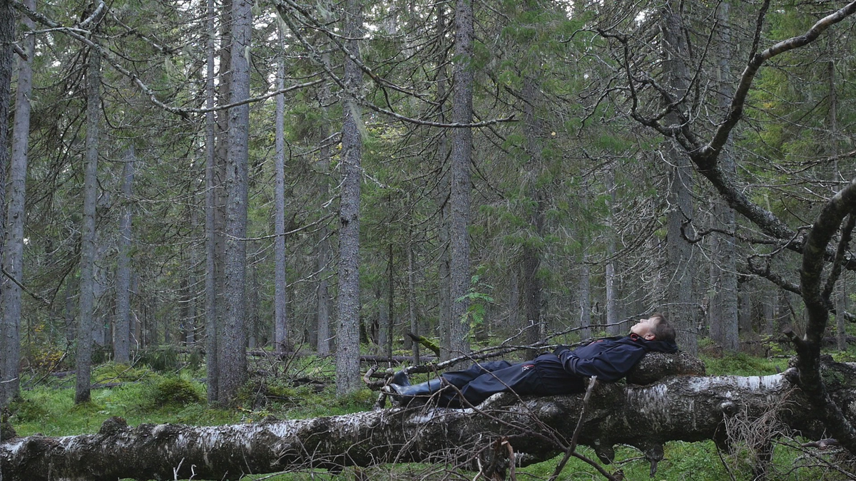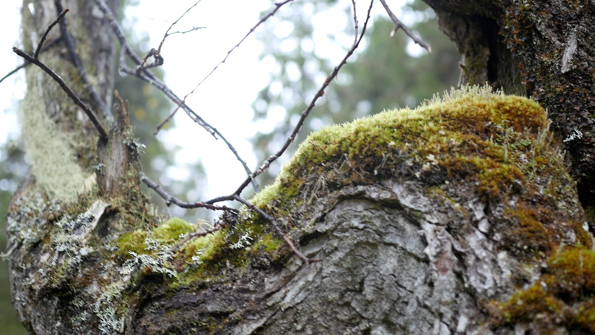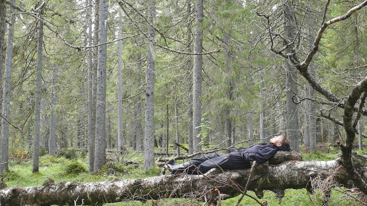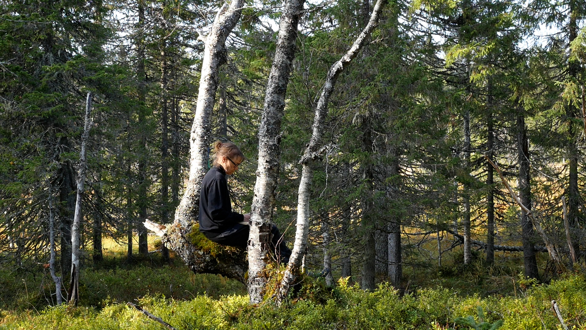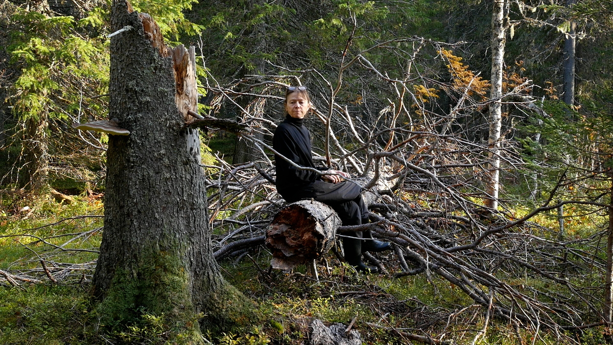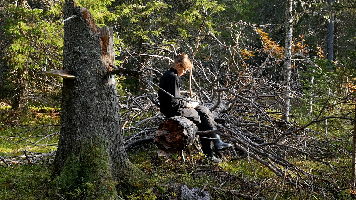 Nice to meet like this, accidentally, on the path. I was on my way to visit the deceased spruce tree nearby when I suddenly noticed the soft green moss that grows on your trunk at the point where it is divided into several branches, almost like a small comfortable armchair, really. And the sun was shining on it in such an inviting way that I decided to sit down for a moment in front of the camera and write a few words to you. Perhaps you find it strange that I address you in Swedish here in the heart of Finnish Kainuu, where the next language after Finnish or the local dialect probably would be Russian – or then English or German or even Czech that some of the guests in the Mustarinda house nearby probably speak if they happen to pass by here. I choose to write to you in Swedish, however, not so much for our sake but for my own sake, to see how it feels. Because, honestly speaking, I don’t think it matters to you what language I write. What perhaps, possibly and hopefully matters is whether I manage to articulate my thoughts with the help of writing or not. So far, I have only chatted away in order to get going. Do I have something to tell you or even something to tell myself right here, right now today? This is my last day in Mustarinda, my last day in this old silent forest that I have learned to love, with its thick soft moss, the many dead trees lying here and there and the fresh air, which is so soft and lovely to breath. I know I am going to miss this forest, and I will try to visit forests closer to me, later. I hope you enjoy your living quarters here next to the path and near the bog that opens immediately on the other side. You have two painted slashes of colour on one of your trunks, a blue and a green one, to indicate the two paths that are here merged and divide into separate paths a bit further on. You have lived here for quite a while, I suppose, although you are not exactly an old one. Perhaps you are older than your looks if there has been a shortage of light or nutrients here; or then you are not that old but look older due to the cold winters with heavy snow, which has damaged many of the spruces here. Because you shed your leaves it is not as dangerous for you, I guess; your bare branches are not gathering such heavy burdens that would then break them. But the moss I am sitting on involves another kind of risk. If it will gather moisture, there will be rot and you might actually fall in two pieces with time. That can sometimes happen old trees, which have a forked branch or a divided trunk. Forgive me for sounding like a jinx, I think you are perfectly fine here and as far as I can see there is nothing wrong with you. On the contrary, I should be grateful for the moss that you carry, because despite being rather wet it is soft and pleasant to sit on, like a cushion intended for passers-by. Yes, I know it is not intended for that and I suppose you would prefer to get rid of it – although I do not really know. Perhaps you are engaged in some kind of collaboration, the moss and you, like the famous collaboration between the fungal mycelium and your roots. But now I am speculating about things I only read about rather than trusting my senses and my sensations here and now. – The loveliest thing about this forest is the silence. Now when there is no wind it is really silent. No distant motor noise – a single airplane occasionally, and very rarely. Right now, it is so quiet that the sound of the pen scraping against the paper feels loud. While it is calm the mosquitoes appear although it is late autumn here. The sun, however, is warm right now, and the fog during recent days, not to mention the amount of rain earlier, have provided the perfect circumstances for all kinds of mosquitoes to have another round. – It is so quiet I thought I heard the camera stop. In any case it is time to finish this letter. I regret that I don’t really have any thoughts to articulate right now. I am happy and grateful, however, for getting to sit a moment in your “arms” and wish you all the best for the future. Thank you!