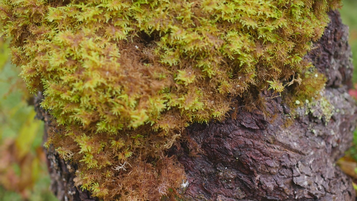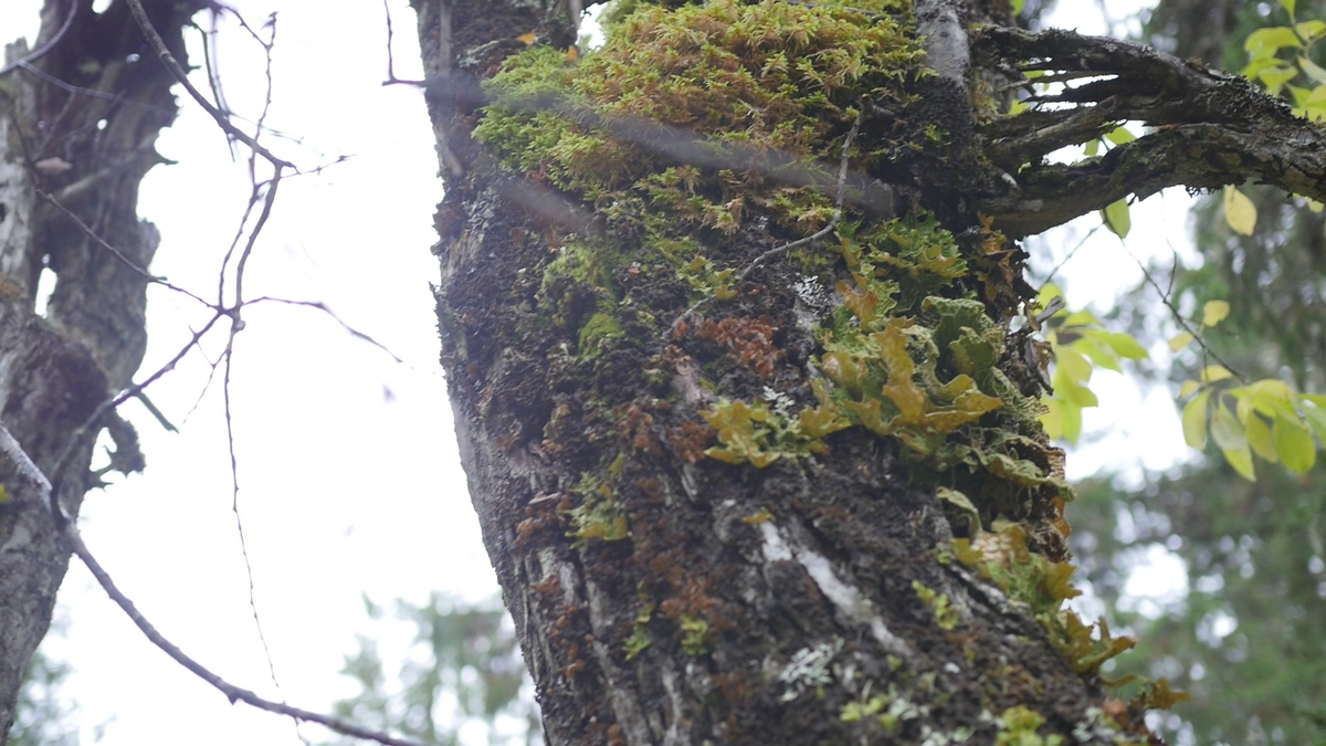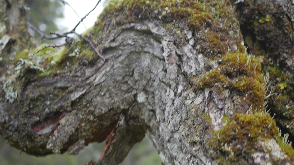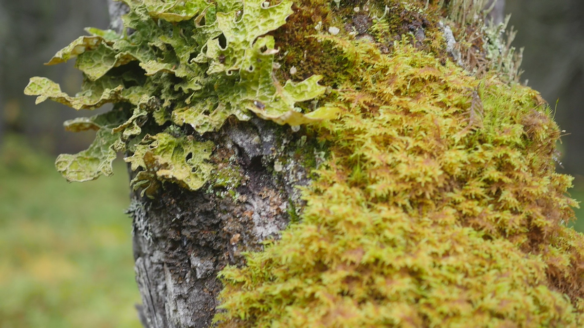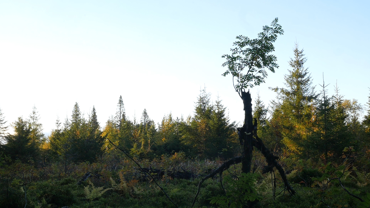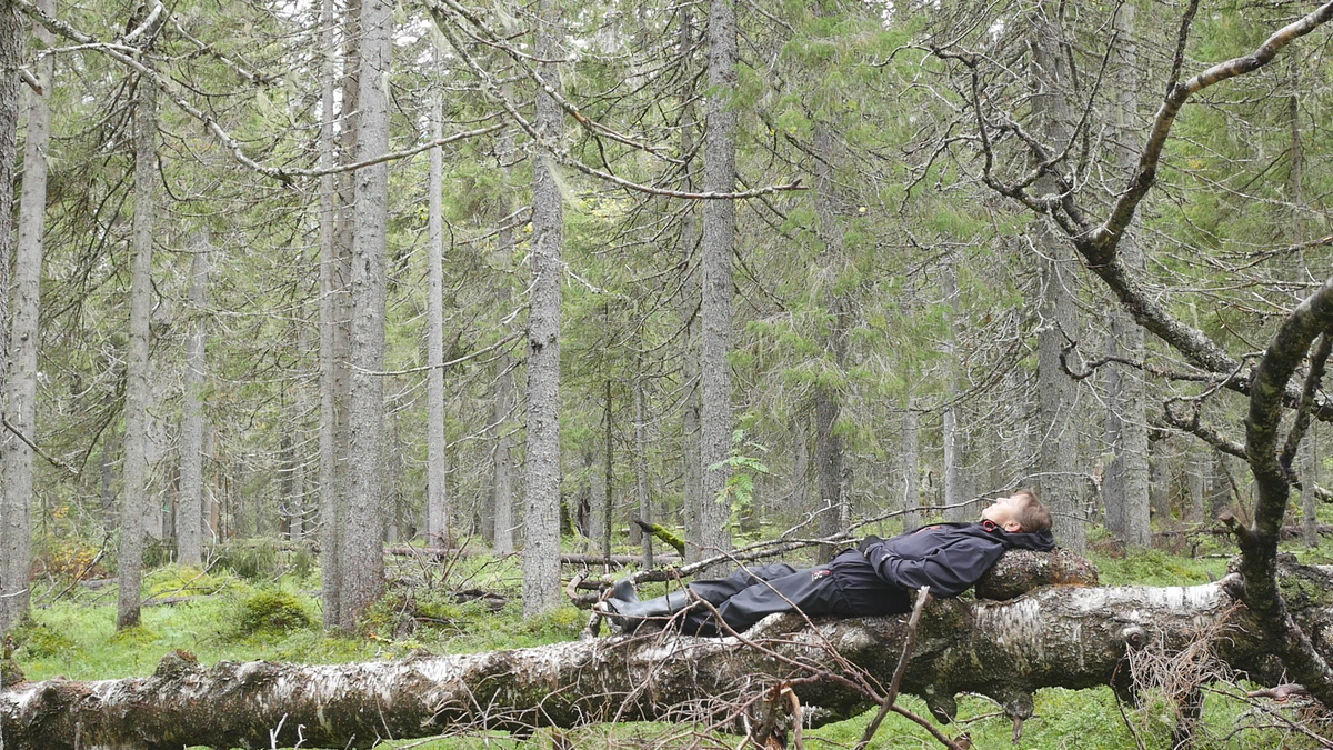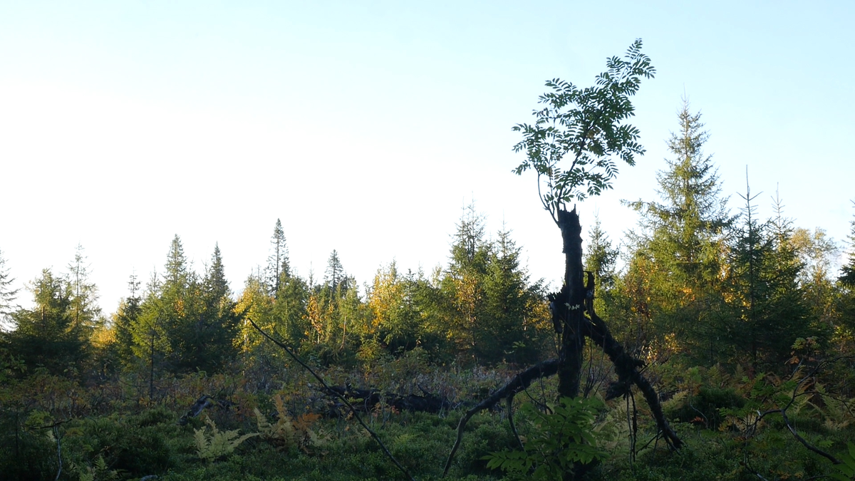 Nice to meet like this, accidentally, on the path. I was on my way to visit the deceased spruce tree nearby when I suddenly noticed the soft green moss that grows on your trunk at the point where it is divided into several branches, almost like a small comfortable armchair, really. And the sun was shining on it in such an inviting way that I decided to sit down for a moment in front of the camera and write a few words to you. Perhaps you find it strange that I address you in Swedish here in the heart of Finnish Kainuu, where the next language after Finnish or the local dialect probably would be Russian – or then English or German or even Czech that some of the guests in the Mustarinda house nearby probably speak if they happen to pass by here. I choose to write to you in Swedish, however, not so much for our sake but for my own sake, to see how it feels. Because, honestly speaking, I don’t think it matters to you what language I write. What perhaps, possibly and hopefully matters is whether I manage to articulate my thoughts with the help of writing or not. So far, I have only chatted away in order to get going. Do I have something to tell you or even something to tell myself right here, right now today? This is my last day in Mustarinda, my last day in this old silent forest that I have learned to love, with its thick soft moss, the many dead trees lying here and there and the fresh air, which is so soft and lovely to breath. I know I am going to miss this forest, and I will try to visit forests closer to me, later. I hope you enjoy your living quarters here next to the path and near the bog that opens immediately on the other side. You have two painted slashes of colour on one of your trunks, a blue and a green one, to indicate the two paths that are here merged and divide into separate paths a bit further on. You have lived here for quite a while, I suppose, although you are not exactly an old one. Perhaps you are older than your looks if there has been a shortage of light or nutrients here; or then you are not that old but look older due to the cold winters with heavy snow, which has damaged many of the spruces here. Because you shed your leaves it is not as dangerous for you, I guess; your bare branches are not gathering such heavy burdens that would then break them. But the moss I am sitting on involves another kind of risk. If it will gather moisture, there will be rot and you might actually fall in two pieces with time. That can sometimes happen old trees, which have a forked branch or a divided trunk. Forgive me for sounding like a jinx, I think you are perfectly fine here and as far as I can see there is nothing wrong with you. On the contrary, I should be grateful for the moss that you carry, because despite being rather wet it is soft and pleasant to sit on, like a cushion intended for passers-by. Yes, I know it is not intended for that and I suppose you would prefer to get rid of it – although I do not really know. Perhaps you are engaged in some kind of collaboration, the moss and you, like the famous collaboration between the fungal mycelium and your roots. But now I am speculating about things I only read about rather than trusting my senses and my sensations here and now. – The loveliest thing about this forest is the silence. Now when there is no wind it is really silent. No distant motor noise – a single airplane occasionally, and very rarely. Right now, it is so quiet that the sound of the pen scraping against the paper feels loud. While it is calm the mosquitoes appear although it is late autumn here. The sun, however, is warm right now, and the fog during recent days, not to mention the amount of rain earlier, have provided the perfect circumstances for all kinds of mosquitoes to have another round. – It is so quiet I thought I heard the camera stop. In any case it is time to finish this letter. I regret that I don’t really have any thoughts to articulate right now. I am happy and grateful, however, for getting to sit a moment in your “arms” and wish you all the best for the future. Thank you!