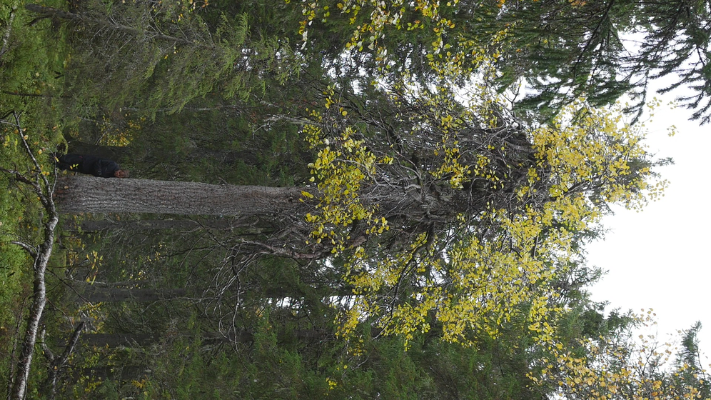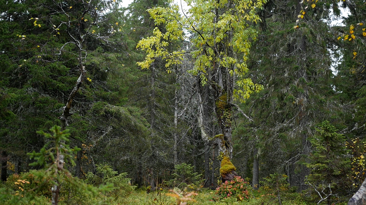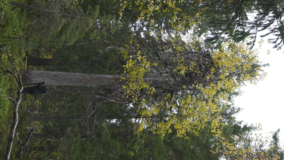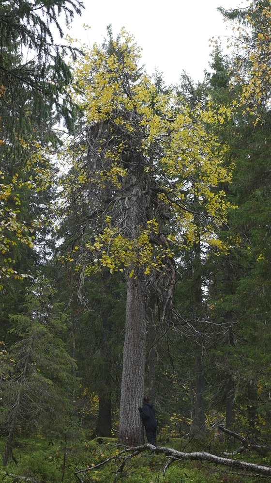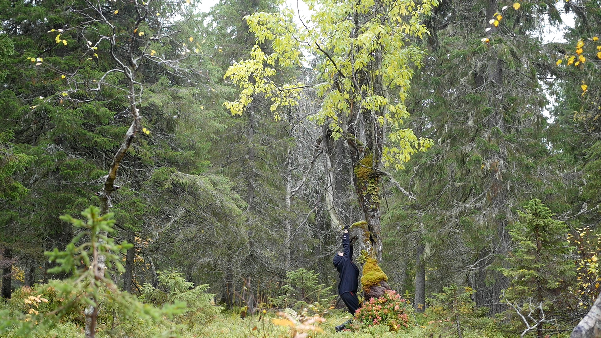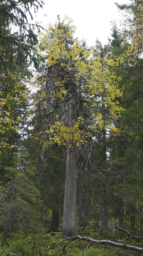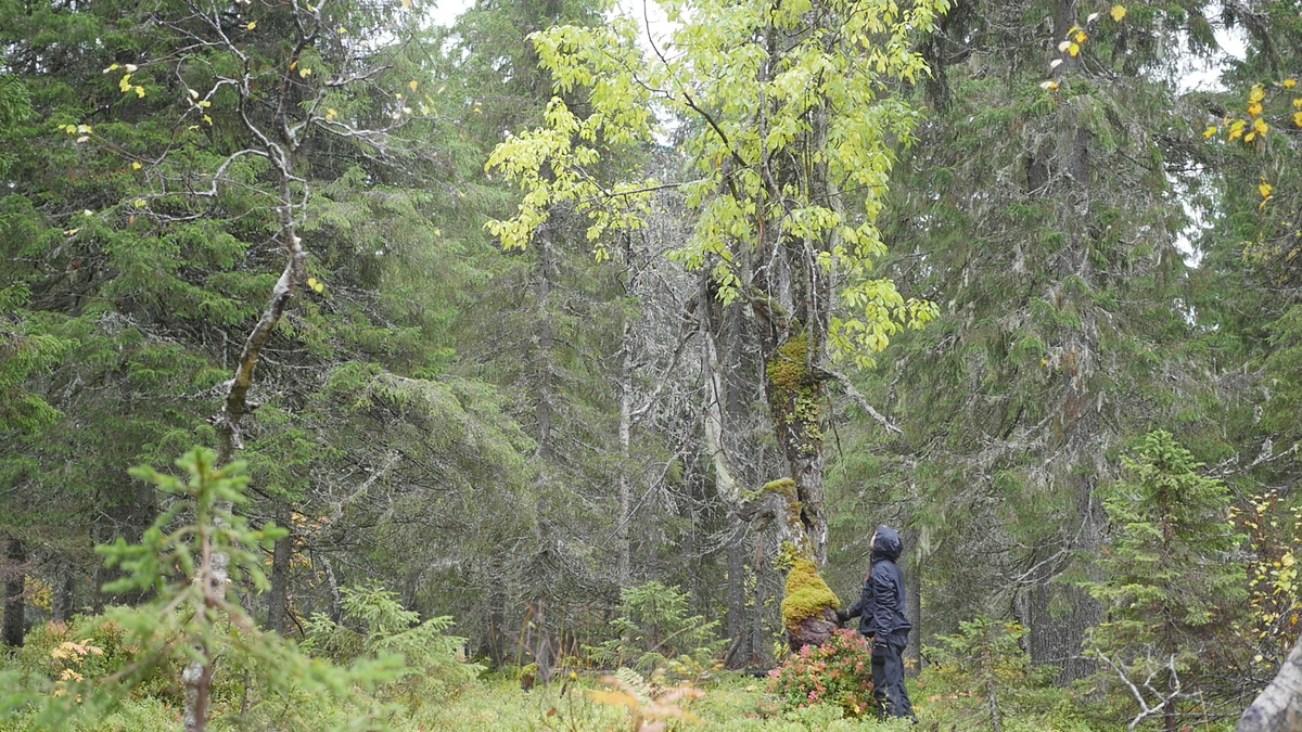 Kära Björk, trevligt att träffas så här, smått överraskande, på stigen. Jag var egentligen på väg att besöka den avlidna granen här intill, när jag plötsligt fick syn på den mjuka gröna mossa som växer på din stam där den förgrenar sig, som en liten bekväm fåtölj, faktiskt. Och solen lyste så inbjudande på den, att jag bestämde mig för att sätta mig ner en stund framför kameran och skriva några ord till dig. Du kanske tycker att det är underligt att jag tilltalar dig på svenska, här mitt i det finska Kajanaland, där nästa språk efter finskan och den lokala dialekten antagligen skulle vara ryska – eller då engelska eller tyska eller tom tjeckiska, som några av gästerna i Mustarinda-huset här intill förmodligen talar, ifall de råkar gå här förbi. Men jag väljer att skriva till dig på svenska, inte så mycket för din skull som för min egen skull, för att se hur det känns. För ärligt talat tror jag inte det spelar någon roll för dig vilket språk jag skriver på. Men det som kanske, eventuellt, och förhoppningsvis har någon betydelse är, ifall jag lyckas artikulera mina tankar med hjälp av att skriva, eller inte. Och än så länge har jag bara pladdrat på för att komma igång. Har jag något att tala om för dig eller något att säga ens mig själv just här, just idag? Det är min sista dag i Mustarinda, min sista dag i den här gamla tysta skogen som jag lärt mig att älska, med sin tjocka mjuka mossa, sina många döda träd liggande om vartannat, och sin friska luft som är så mjuk och härlig att andas. Jag kommer att sakna den här skogen, det vet jag, och jag kommer också att försöka besöka skogar som finns närmare mig, senare. Jag hoppas du njuter av din boplats här, intill stigen, och nära kärret som öppnar sig genast på andra sidan den. Du har faktiskt två målade färgklickar på en av dina stammar, en blå och en grön, för att markera de två stigarna som här är sammanslagna, och som förgrenar sig lite längre bort. Du har levt här en bra stund, antar jag, även om du inte är någon åldring precis. Och det kan hända att du faktiskt är äldre än du ser ut, ifall det varit ont om ljus eller näringsämnen här; eller så kan det ju hända att du inte är så gammal, men ser äldre ut på grund av de kalla vintrarna med tung snö, som skadat många av granarna här. Eftersom du fäller dina löv är det inte lika farligt för dig, antar jag; dina kala grenar samlar inte på så tunga bördor som sedan kunde knäcka dem. Men mossan jag sitter på är en annan slags riskfaktor. Om den samlar väta skapar den röta, så att du faktiskt kan falla i tu med tiden. Det händer ibland åt gamla träd som har en grenklyka eller en fördelad stam. Förlåt att jag låter som en olycksfågel, jag tror du har det bra här och så vitt jag kan se går det ingen nöd på dig. Jag borde tvärtom vara tacksam för mossan du bär på, för trots att den är ganska våt och kall är den mjuk och behaglig att sitta på, som en kudde avsedd för förbipasserande. Ja, jag vet att den inte är avsedd för det, och jag antar att du egentligen hellre skulle bli av med den – fast det vet jag egentligen inte. Kanske ni har något slags samarbete på gång, mossan och du, precis som det berömda samarbetet mellan svampmyceliet och dina rötter. Men nu spekulerar jag om sådant som jag bara läst om, istället för att lita på mina egna sinnen och förnimmelser här och nu. – Det som kanske är det härligaste med den här skogen är tystnaden. Nu när det inte blåser är det verkligen tyst. Inget avlägset motorbrus – någon enstaka gång ett flygplan, men det är väldigt sällan. Och just nu är det så tyst att pennans skrapande mot papperet känns som rätt högljutt. Eftersom det är vindstilla, kommer myggen fram, trots att det är sent på hösten här. Men solen värmer just nu, och dimman dagarna innan, för att inte tala om mängden regn tidigare, har bjudit på perfekta omständigheter åt all slags mygg att ta en extra runda. – Det är så tyst att jag trodde mig höra kameran gå av. Det är oberoende av dags att avsluta det här brevet. Jag beklagar att jag inte egentligen har några tankar att artikulera just nu. Men jag är glad och tacksam att jag fått sitta en stund i din famn, och önskar dig allt gott framöver. Tack!