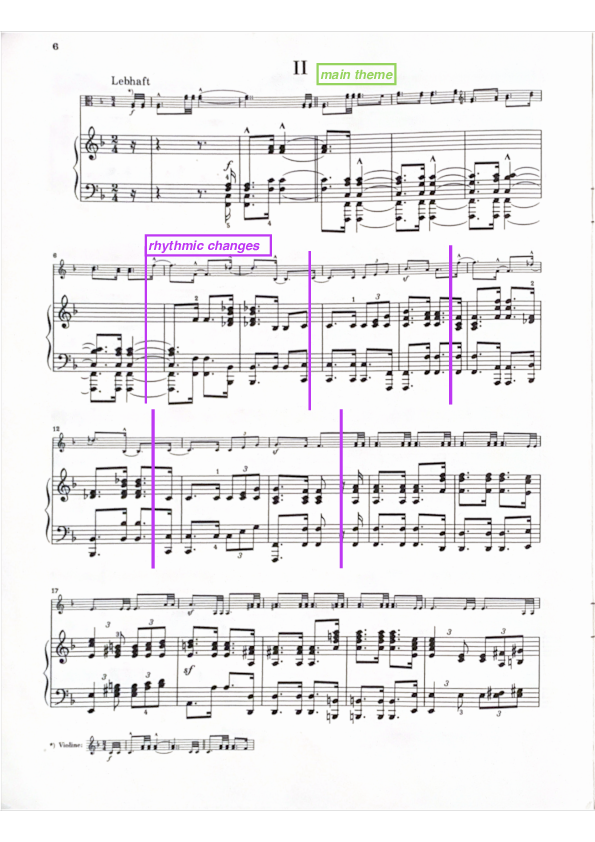 The single-note hairpins in bar 7 and 8 could insinuate a certain restlessness and questioning. The four-bar phrase is then repeated again, but now with a different answer: in F-major. A new melody starts in the piano accompanied by floating 16ths in the viola. When the new melody seems to resolve in a final F-major chord, a new section starts with 16th triplets in the piano. The character of this section is more restless, as if the acceptance-like melody also brings worries about what comes next. At some point a slight hint of Ave Maria seems detectable as a possible prayer to god. After this more restless passage, the beginning theme enters again. The acceptance now seems even stronger.
