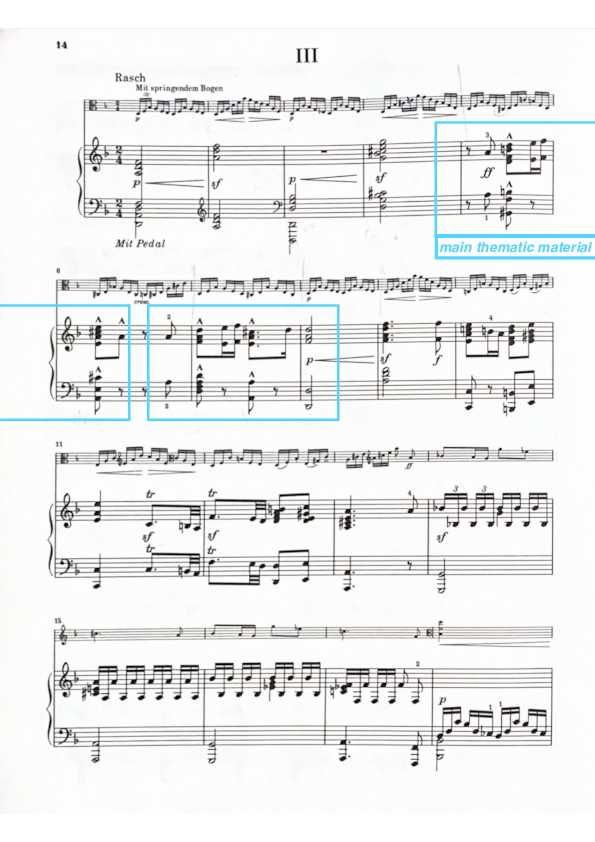 In 1782 Johann Wolfgang von Goethe (1749 – 1832) wrote the poem The Erlkönig. This poem tells of a father who sets off on horseback at night with his fevered son in order to seek help. Franz Schubert (1797-1828) set this story in song form in 1815, which may have inspired Schumann. This movement starts with a fiery character created by the speedy passages in the viola (maybe a galloping horse) embedded by ominous chords in the piano. Throughout the movement the roles of the viola and piano change (see excerpt) The middle section of this movement then appears very suddenly as a bolt out of the blue. However, the character is anything but ‘bolt’-like. The tonality is B-major (preceded by D-minor) and the thematic material is lyrical and giddy. This passage could be seen as a feverish dream. However, the dream lasts only for a short time and the ominous 16th triplets in the viola occur again. The end of this movement comprises two lyrical bars with a final outburst in both instruments. In the Erlkönig, the man arrived at his destination, but it was too late: the child died. His father cries out in sorrow.