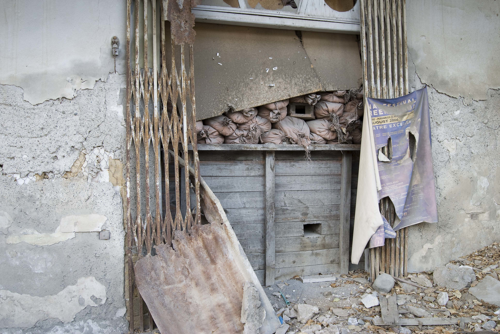 The photographs address memory and the landscape of conflict and seek to engage with the dilemma of aesthetics and politics. The images intentionally resist literal and figurative interpretations and deliberately frame every element within their content as having no more or less significance. So, within the now re-wilded landscape, everything seems ‘natural’ or matter of fact, including bullet-pocked walls, wire fences marking a mine field, territorial flags, and domestic remnants. By paring back the emotional rhetoric of each photograph – presenting an unembellished image – each depiction presents a kind of document that acknowledges the detached and ruptured world captured within the Buffer Zone: neither a theatrical space, nor an incontrovertible truth, but something that acknowledges both the construct of the Zone and the unknowability behind its appearance.