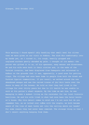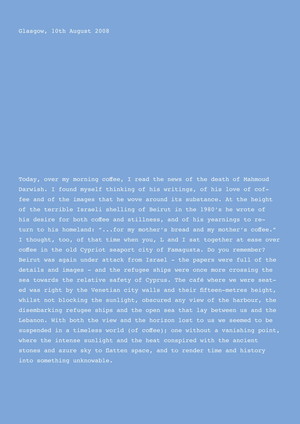 [1] The Coffee Letters' first iteration was two letters: one from North Nicosia and from Glasgow, written in the mid-2000s. Since then the enlarged body of work has found form in the following places:
