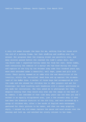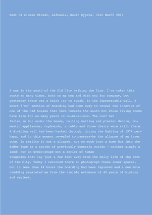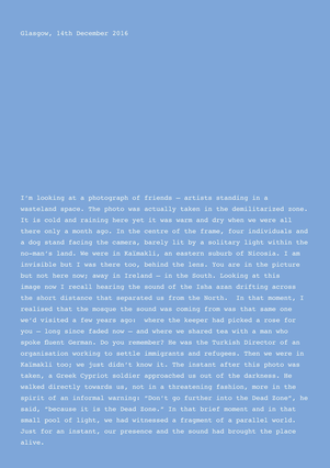 The concept of the fragmentary view held within the letters is particularly relevant to the context of Cyprus. The divided island precludes a view of the united whole, and the Buffer Zone which spans the whole island, East to West, provides the physical periphery of each nation state. The letters, written from both the North and the South register that peripheral state most potently when located in Nicosia: the divided city at the very heart of the island. Within the walls that, during the Venetian period, protected the whole City, the sounds, smells, visual glimpses of parallel worlds that once were one, collide and drift across from the North (the Turkish Republic of Northern Cyprus) to the South (the Republic of Cyprus) and back again.