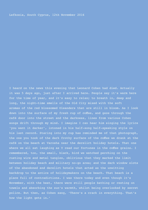 Written jointly, the letters assume the voice of an anonymous ‘I’ and are written to an unnamed ‘you’, whose location is unspecified. The letters forge a relationship – by means of reflecting upon historical and current events, and moments suggested as shared – that reaches across continents, cultures and time. Incorporating empirical knowledge, fieldwork, direct observation, reflexive and auto ethnographic methods, they are located in the world of a coffee drinker as liminal observer: absorbed in a transitory world of passage, relative nostalgia, and melancholy. The state provided by this space is one of presence and reflection on cultural, social and political conditions, and is informed by the early political commentary of Christopher Hitchins[2], the ethnographic writings of Yiannis Papadakis[3] and Yael Navaro-Yashin[4] all directly dealing with the aftermath of the 1974 War, the literature and aesthetics of vernacular cosmopolitanism and the tension of borders identified by Stephanos Stephanides and Stavros Karayanni[5], and the strategies of open space appropriations by Stavros Stavrides[6]. It acknowledges, too, the detail of everyday life and place discoursed upon by Michel de Certau[7].