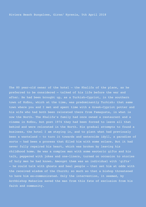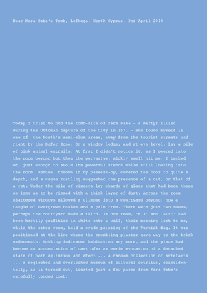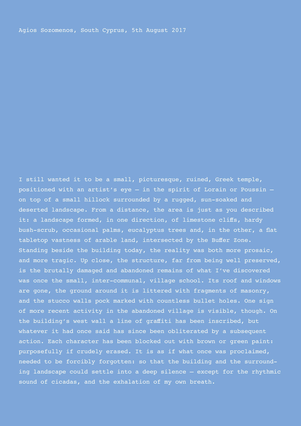 This series of letters, written collaboratively by Glasgow-based artists Susan Brind & Jim Harold, are extracted from an on-going larger project that goes under the working title Coffee Letters. The letters reference observations, events and encounters that have been witnessed together or individually since the turn of the 20th-21stCentury. The particular letters published here are drawn from research journeys undertaken on Cyprus over a period of just over 20 years, although the larger body of writings from which they are extracted relate to peripheral and border locations within the UK, mainland Europe and Scandinavia[1].