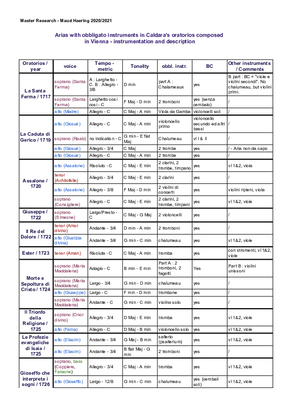 In this chapter I will present you with a list the 38 arias with obbligato instruments that I found in the 21 Viennese Caldara oratorios to which I had access. In the following table you will therefore see their distribution by oratorios, the name of the character, the instruments, as well as the tonality and tempo. Then I will share with you my thoughts about these arias and their distribution between the different registers of voices. Afterwards, you will see a table of all the singers who sung in Caldara's oratorios. This table gives you an idea of the main place that some of the singers had in Vienna. Finally, I will focus on the different instruments used as obbligato.