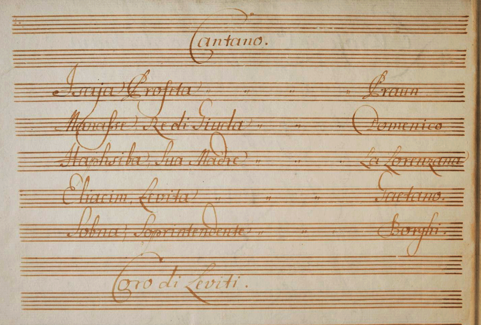 As can be seen in this table, the distribution of arias with obbligato instruments is not necessarily related to the title role of the oratorio. Of the fifteen oratorios with specific instruments, in only half the title role is assigned one or more arias with obbligato instruments. On the other hand, what we can see is the notable recurrence of four singers who sung in most of the 24 oratorios by Caldara composed in Vienna between 1716 and 1736. These were the castrati Domenico (soprano) and Gaetano (alto), the tenor Borosini and the bass Praun (20 oratorios out of 21).