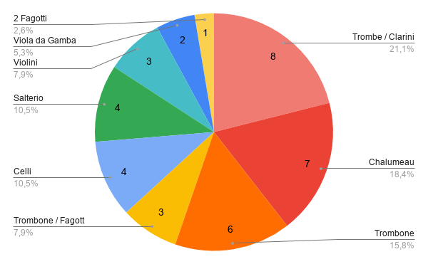Among the 38 arias with obbligato instruments of the Viennese oratorios of Caldara, we can find 2 categories of instruments, divided into 2 sub-categories.