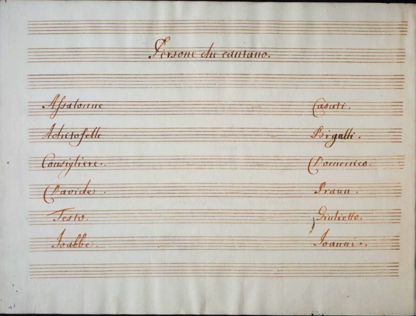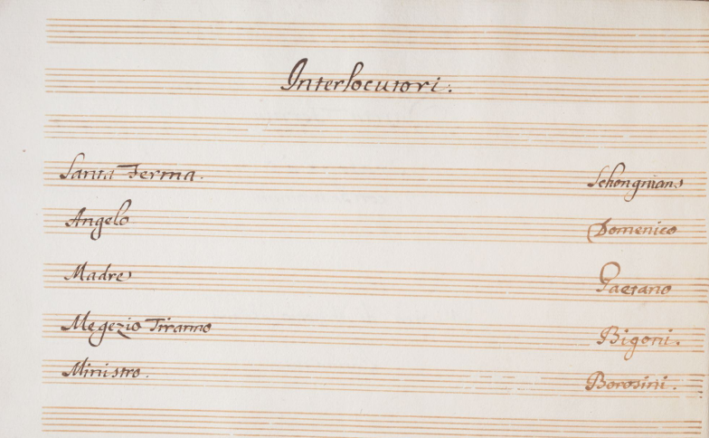 Several oratorios have a name as title. If we consider that the name carried by the oratorio is that of the title role, then we can see that in the majority of oratorios whose title is a name, the main roles have been given to altos or sopranos (Assalone, Ester, La Santa Ferma for instance). We can also refer to the role allocation page in the manuscripts, because very often the order used to make the list of characters seems to be made so that the main characters are at the top of the list, as can be seen below.