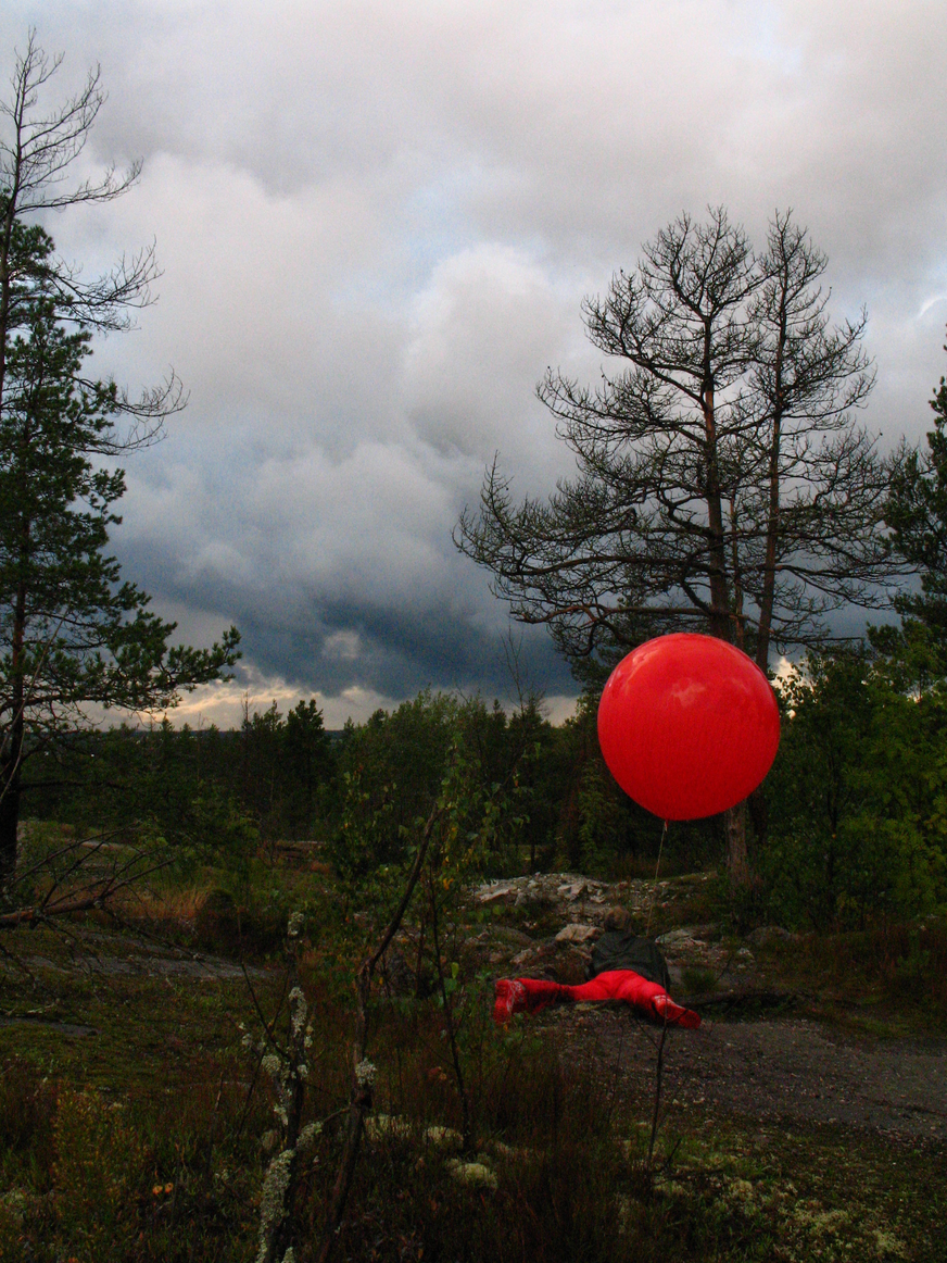I begin amid the things, the performance and the rocks, where walks a human called a spectator or a visitor. He crosses a trench, passes an ancient stone shore, a birch tree coming into leaf, and a pile of planks behind which a hippy lost in the 1970s is lighting a campfire. He reaches the edge of the cliff where there is a white table and two chairs. The visitor sits down at the table. The chair wobbles. He looks at the chart of a cloud classification on the table, originating from the international Cloud Committee at the end of the nineteenth century, the sky and the city. About a kilometre away, on the edge of another cliff, there is a similar table with a man sitting there for hours on end, beginning to feel the chill, watching the clouds, the setting sun, the forest, the motorway and aeroplanes taking off from the runway behind the road. A visitor sits down next to him. A woman holding an enormous red balloon on the end of a string, is crawling through the performance from the first cloud committee table to the other, in amongst the trenches, the ants, the wood violets, the snakes and the spectators. Between the two tables, beneath, at the foot of a third cliff, is a cave where a man and a terrier are wading through the water, one catching air bubbles, the other picking up garbage. Elsewhere in the forest, a woman is standing on stairs without a house, looking into a video camera on a tripod with nobody behind it. A helicopter flies overhead; a bird sings. One visitor sits motionless, for a long time, on a concrete slab in the middle of a clearing that looks like a stage, listening to an mp3 player, looking at the woman listening to the helicopter. This is all recorded on the video camera. Two crouching viewers have come across the time capsule for a fading world, spread out on the moss and in the hollows of the rock face. In another place, a spectator is sitting on the cliff, an ant creeps up her leg; the air smells of rain; planes land and take off; a dog growls; the motorway rumbles. Time passes. The clouds form a queue. The sun sets, the sky heaves.