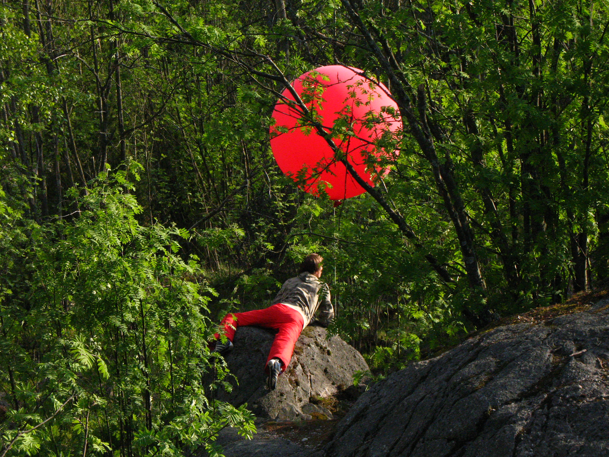 - a woman crawling with a big red balloon about one kilometre across the performance area.
