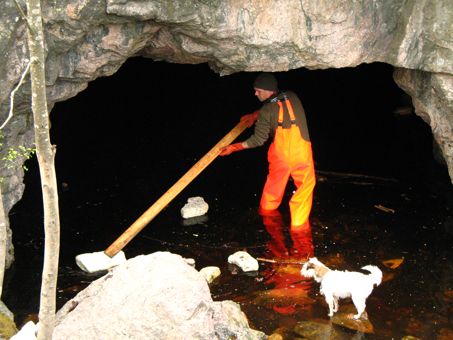 - a man and a dog picking garbage from the water in a cave and posing by the growing pile of garbage after every item.