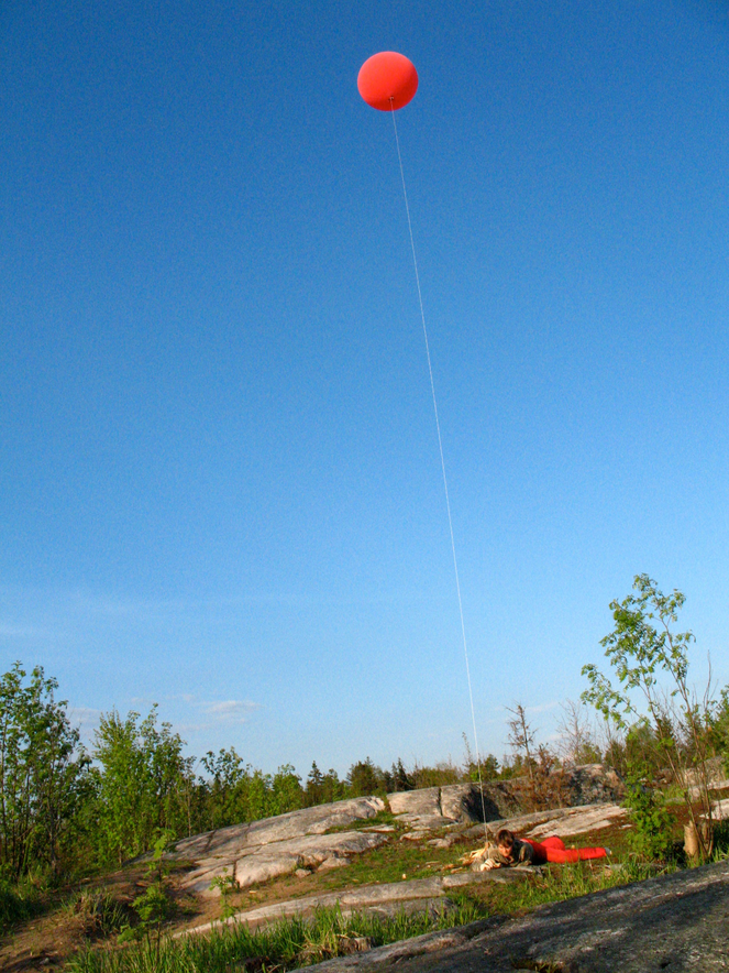 I begin amid the things, the performance and the rocks, where walks a human called a spectator or a visitor. He crosses a trench, passes an ancient stone shore, a birch tree coming into leaf, and a pile of planks behind which a hippy lost in the 1970s is lighting a campfire. He reaches the edge of the cliff where there is a white table and two chairs. The visitor sits down at the table. The chair wobbles. He looks at the chart of a cloud classification on the table, originating from the international Cloud Committee at the end of the nineteenth century, the sky and the city. About a kilometre away, on the edge of another cliff, there is a similar table with a man sitting there for hours on end, beginning to feel the chill, watching the clouds, the setting sun, the forest, the motorway and aeroplanes taking off from the runway behind the road. A visitor sits down next to him. A woman holding an enormous red balloon on the end of a string, is crawling through the performance from the first cloud committee table to the other, in amongst the trenches, the ants, the wood violets, the snakes and the spectators. Between the two tables, beneath, at the foot of a third cliff, is a cave where a man and a terrier are wading through the water, one catching air bubbles, the other picking up garbage. Elsewhere in the forest, a woman is standing on stairs without a house, looking into a video camera on a tripod with nobody behind it. A helicopter flies overhead; a bird sings. One visitor sits motionless, for a long time, on a concrete slab in the middle of a clearing that looks like a stage, listening to an mp3 player, looking at the woman listening to the helicopter. This is all recorded on the video camera. Two crouching viewers have come across the time capsule for a fading world, spread out on the moss and in the hollows of the rock face. In another place, a spectator is sitting on the cliff, an ant creeps up her leg; the air smells of rain; planes land and take off; a dog growls; the motorway rumbles. Time passes. The clouds form a queue. The sun sets, the sky heaves.
