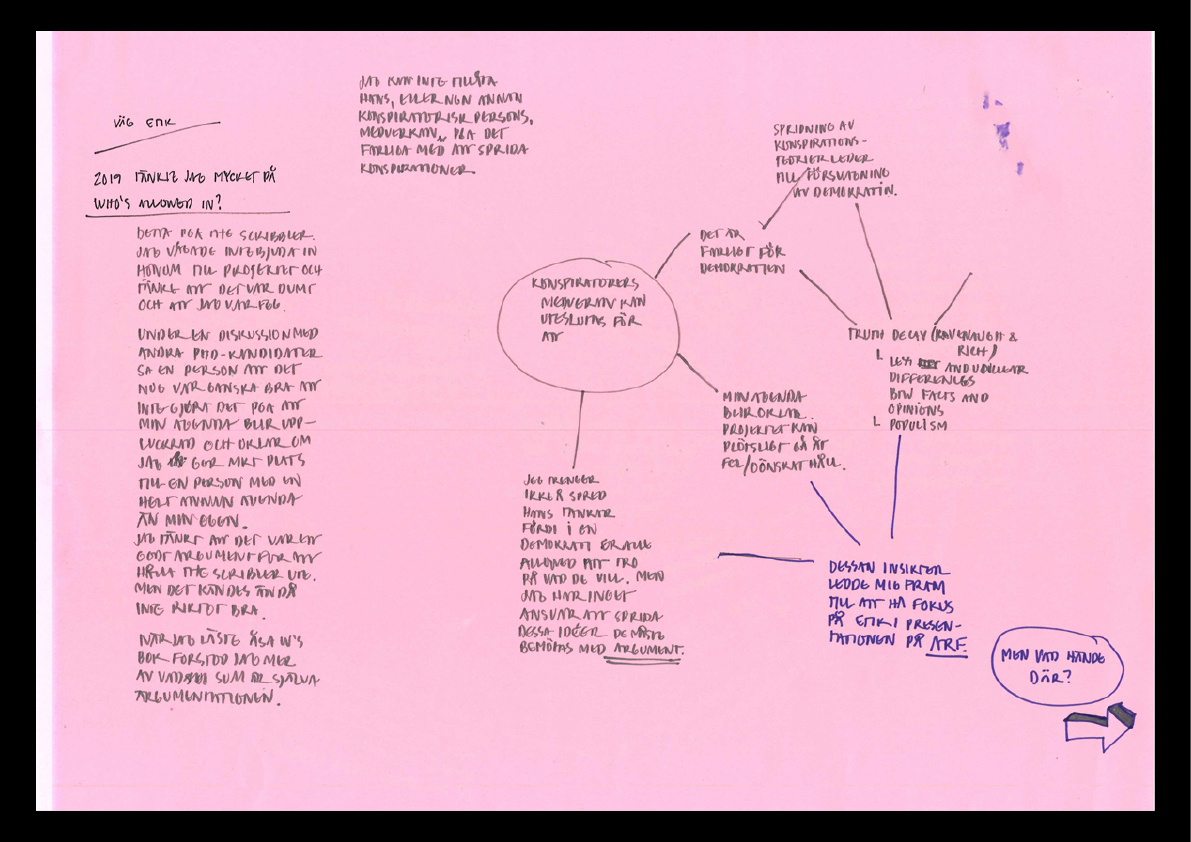 I described, as good as I could, what happened in Stavanger. How I got questions like…but what about fascism?, and me answering that the democratic society allows its citizens to be fascists, to believe in conspiracy theories, and to hate politicians and the establishment and so on. One of the main findings in my latest reading (Därför demokrati by Åsa Wikforss, English translation might be Therefore Democracy) is that in a democratic society everyone are allowed to have all types of opinions, but I don’t have to (nor do I want to) spread these ideas in my project. My understanding of this important because it helps me understand how to handle situations where people tries to interact with the project, but for the wrong reasons (For example the Scribbler man that wrote on the poster in 2019).