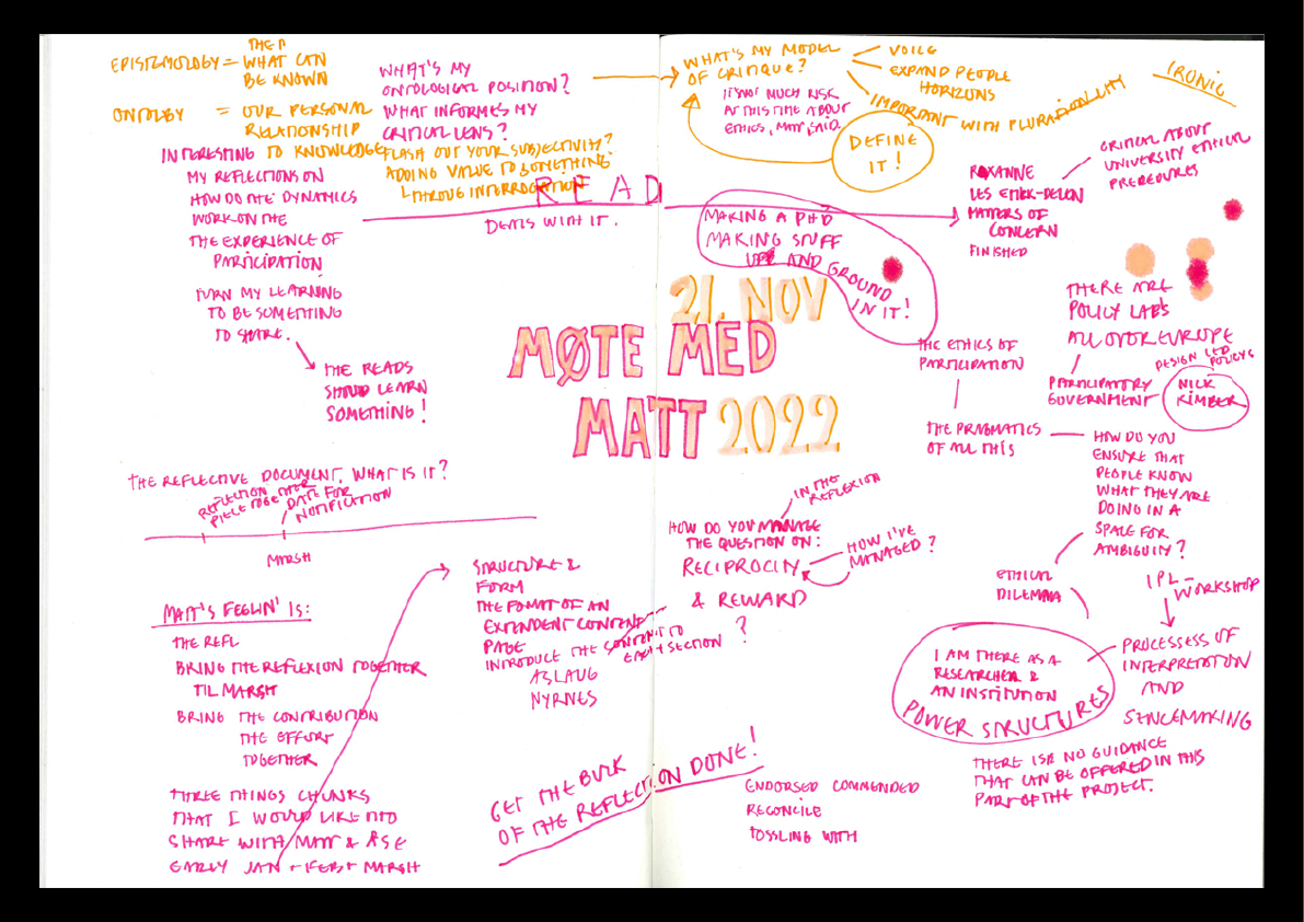 So, what I should do now is WRITE. Matt suggested I’ll write the structure of the reflection (chapters,headlines, sub-headlines, and a little bit of text under all headlines). Important stuff is; my reflection in how the dynamics work on the experience of participation (ok, I really doesn’t remember/understand perfectly what we talked about here, Matt). And how to turn my learning into something to share (the readers should learn something). Bring th contribution and effort together.