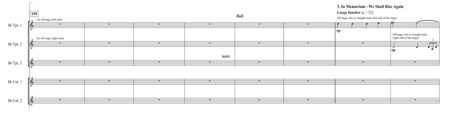 This work seeks to pay tribute to the victims of terrorist attacks in the Belgian capital in 2016.The excerpt I have chosen is within the “In Memoriam” movement, and clearly simulates the trumpet calls at state or military funerals. The composer pays homage to innocent lives lost in an emotional center section of the memory, before bringing a passionate sense of hope to the search for a new era of communal understanding.It premiered in 2017 in Austria, but in just a few years it became one of the most acclaimed and performed musical works.