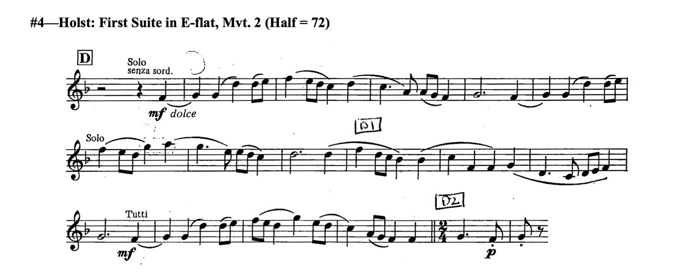 Depending on the nature of a particular trumpet solo, I would suggest to perform exercises more focused on the mental visualization of images, sounds and memories, which would make the student understand and interpret the excerpt with greater accuracy and personality. These exercises are based on the work of various psychologists specialized in music, sports or other areas in which you need to perform at your maximum potential at a given time and when the pressure is high.