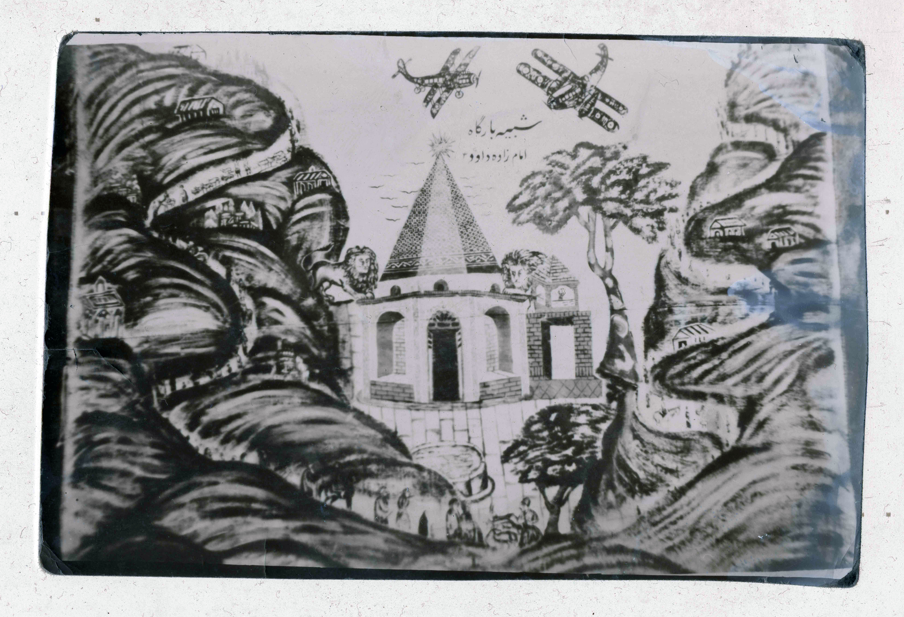 There is a naïve painting discernible in the background: an airplane bearing the name “Iran” (Nastaligh) in Old Persian typography. Its wings have been drawn out of perspective, in a mêlée with reality. The plane is flying above another sacred mausoleum—the Shah Abdol-Azim—in Rey, south of Tehran. This image, too, is an amalgamation of belief and desire, mobility and playfulness.