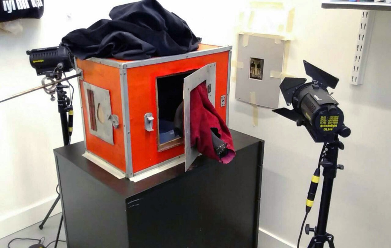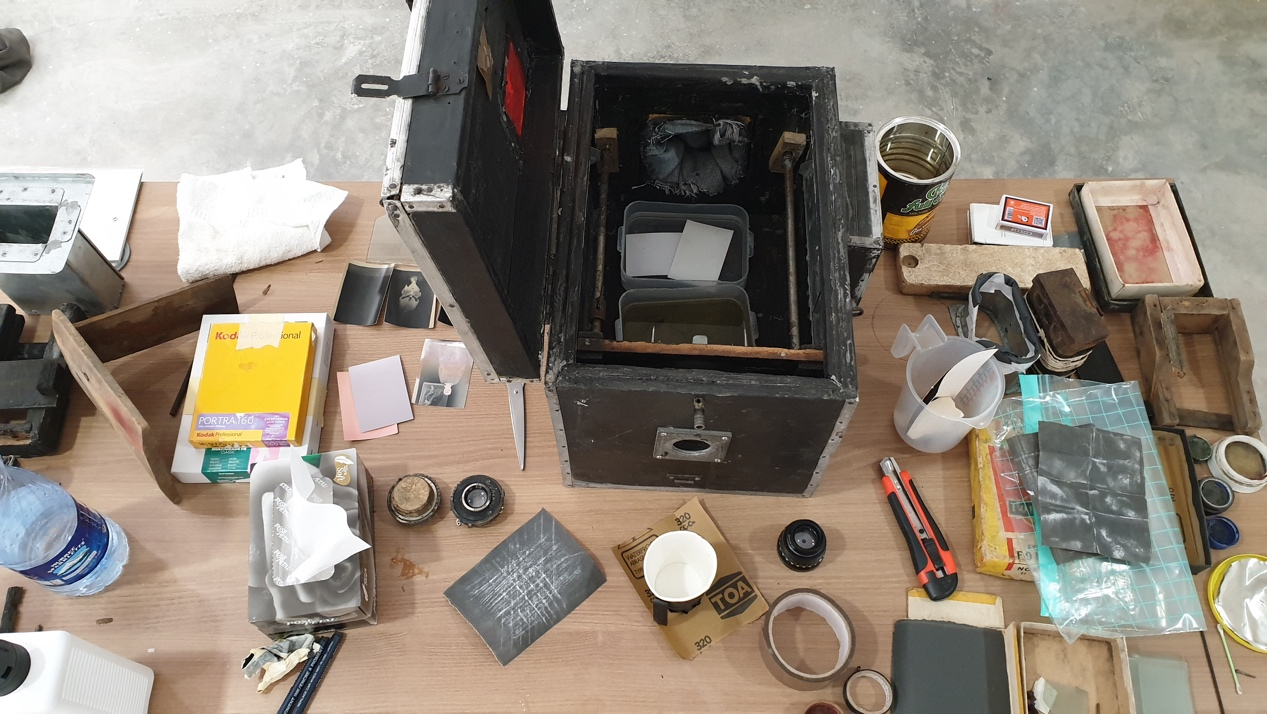 This is the historical backdrop of the camera used by Rajab and Gholamreza. In the early twentieth century, such devices—essentially a portable wooden hut with a lens—enjoyed widespread use in places like Brazil and Cuba (where they were known as camera minutera) and in Afghanistan (as kamra-e-faoree). [21] Public portrait photography was common. The devices used paper negatives and combined a box camera with a portable darkroom. Some types repurposed the front bellows section of an old camera, which was attached to one end of the processing box; others used an internal focus mechanism, comprised of a view screen and film holder bracket that slid on internal metal rods and could be controlled by a focus rod at the rear of the camera. The operator accessed the camera via a sleeve that fit tightly over the arm. The process required only two chemicals: developer and fixer. From the posing of the subject to the production of a wet print, a typical session might take all of fifteen minutes. [^23]