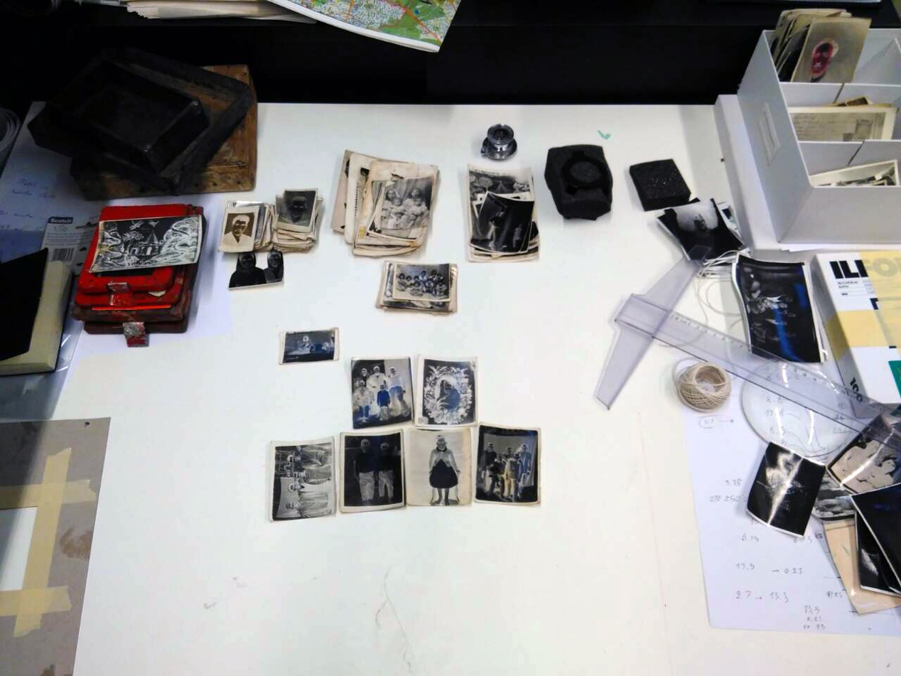 She limps out of the room, supporting her back with her left hand, and returns several minutes later with an old plastic bag. The bag is full of dark images—photo negatives, printed on paper.