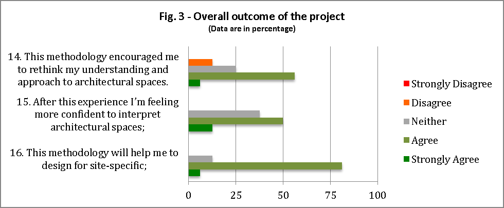 I designed the last three questions to measure the impact of the project based on my research question aligning with the learning outcomes. The results confirmed that the project has been quite successful, even if carried over in a short amount of time. Q14 ‘This methodology encouraged me to rethink my understanding and approach to architectural spaces’ scored 56.2% (agree) and 6.2% (strongly agree), only 12.5% of students answered with a ‘disagree’. Q15 ‘After this experience I’m feeling more confident to interpret architecture’ was focused on the students’ specific curriculum and received a total score of 62.5% (agree + strongly agree) and 0% disagree. The most solid positive result was scored for Q16 ‘This methodology will help me to design for site-specific places’ with an overwhelming 81.2% (agree) and 6.2% (strongly agree).