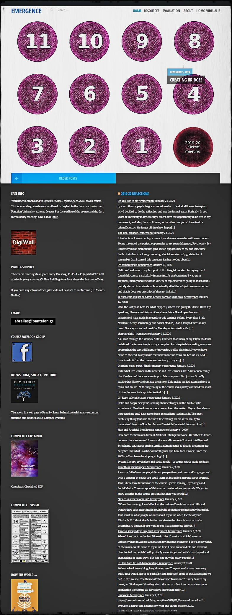 A central course hub is necessary for creating the supporting infrastructure of the learning rhizome. The central hub aggregates the flow of the individual contributions and makes them available to the whole group. For the “Systems Theory, Psychology and Social Media” course, the central hub is located at http://emergence.edublogs.org