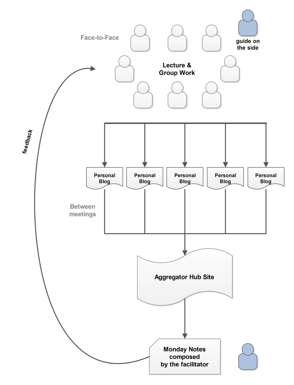 The hub aggregator site "created a sense of co-creation with others in that a student could experience the group’s reflective context; a participant could situate his/her own reflection in the group’s wider reflective virtual space by not only interacting with the others in the preceding face-to-face session but also by seeing and experiencing the process of other people’s reflections. Thus, the aggregator web spot was furthering the group work online and fostering a sense of working together in a community of practice to collectively produce a digital artifact. In the described system, the initial meaningful face-to-face session ensured an overall effective blended learning design." (Brailas et al., 2016)