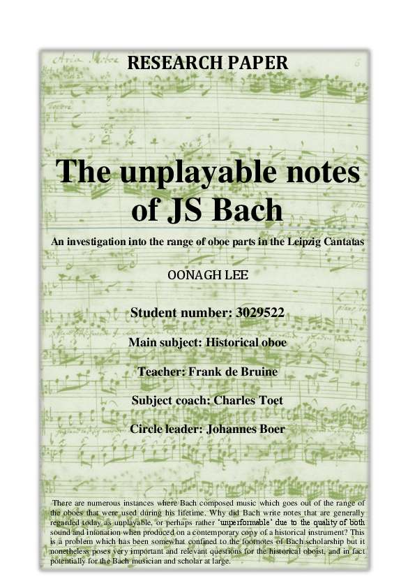 Today there is little doubt that the oboe was one of Bach's most favoured instruments, and that it was an instrument with which he was extremely familiar. Yet, in spite of this, Bach composed numerous works which includes notes that are not playable on the model of oboe that we know were used during his lifetime. Why did Bach write notes that are generally regarded today as unplayable, or perhaps rather ‘unperformable’ due to the quality of both sound and intonation when produced on a contemporary copy of a historical instrument? This is a problem which has been somewhat confined to the footnotes of Bach scholarship but it nonetheless poses very important and relevant questions for the historical oboist, and in fact potentially for the Bach musician and scholar at large.