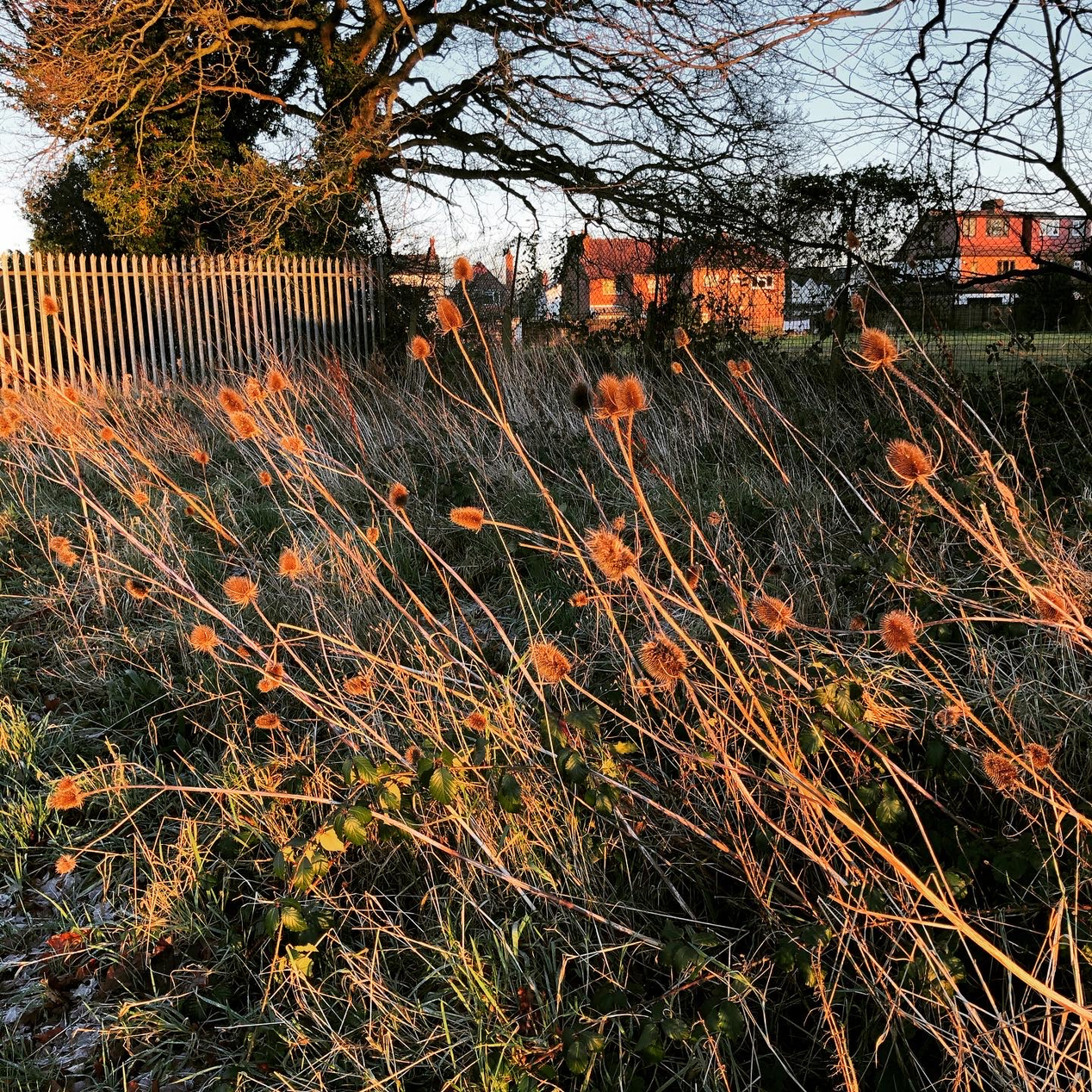 I cover the dahlia bed and a section at the bottom by the shed that needs to be fallow for a while. I notice the golden glow of winter sun on the teasels as I leave. It is so beautiful and it warms my heart.