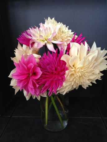 The dahlias are still flowering. The Café au Lait, five of them so proud and resplendent, a bright pink cactus, a pink/yellow waterlily variety, and a white cactus all signal proudly their defiance of the change of season. They will flower until the first frost and then turn completely black overnight.