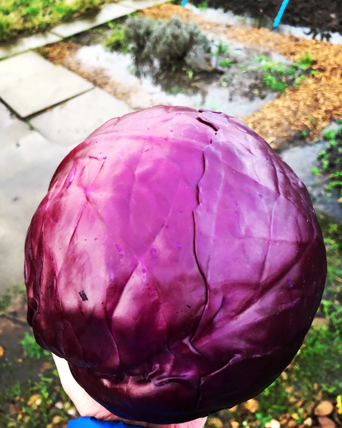 I pull up a huge and beautiful red cabbage to take my mother in law for Christmas dinner. It’s dense and the slugs have only penetrated into the first few layers of leaves. I imagine it must weigh about 5 kilos. Removing these top layers stains my fingers red. I marvel at the gorgeousness of nature, at how I planted a tiny seed and this beauty grew from it.