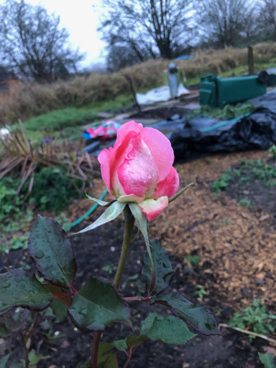 To get dressed and wash my face and go to the plot with the kitchen waste for the compost is quite an achievement, and I feel better for it. One rose defiantly rises at the top of a bush. It’s been in bud for weeks, giving a little sign of defiance at the top of a bleak mid-winter plot. I cut it and take it home and it opens in the warmth of the house quite quickly. It speaks as a symbol of resilience. It feels like a nice analogy for how we all need a little tenderness to make it through dark days. I know that I am resilient, but sometimes I do not want to have to be.